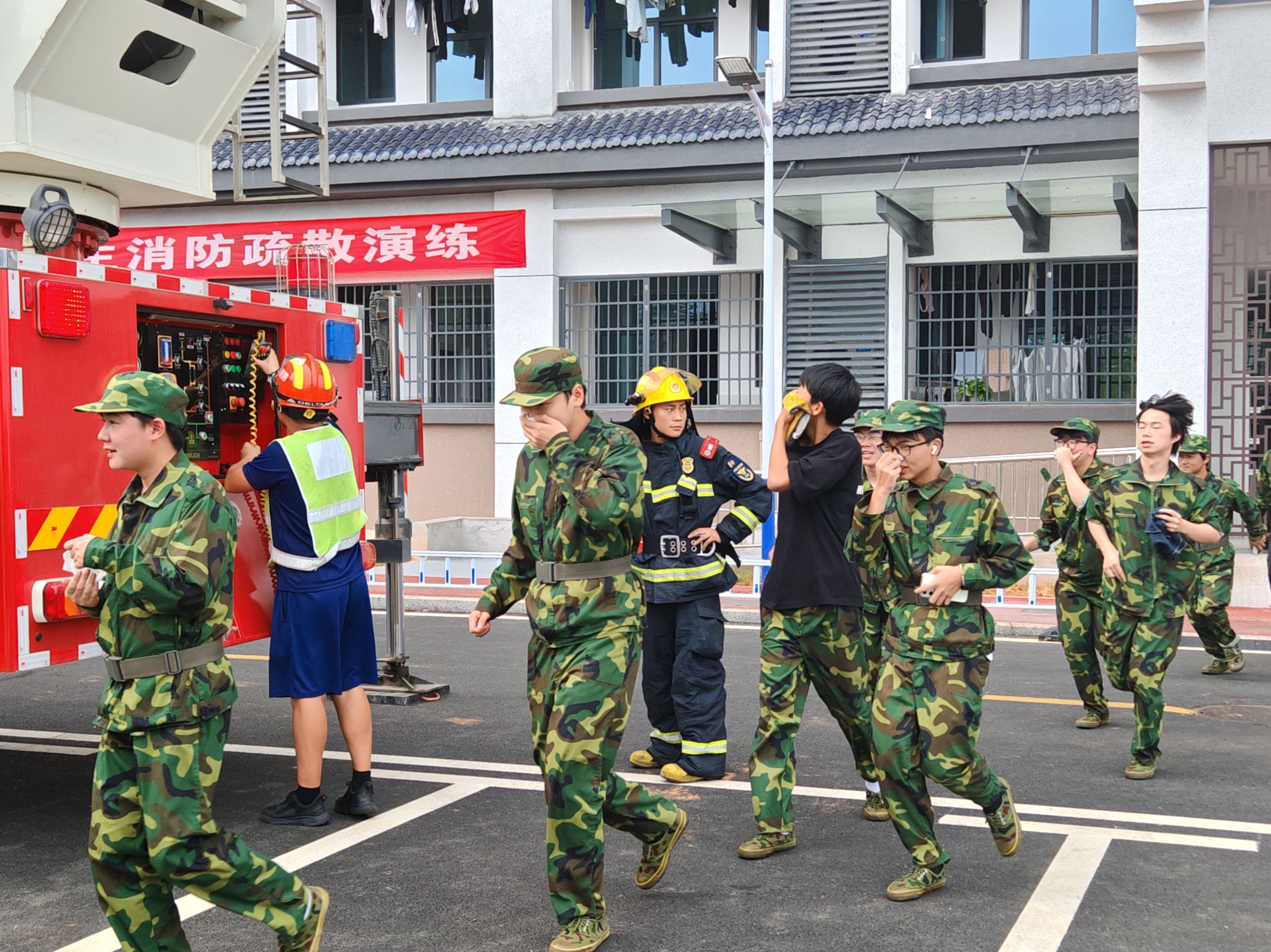 本次演练模拟了从火灾发现、启动应急系统、汇报火情到疏散学生的全过程。随着警报铃声的响起,同学们在工作人员的指挥下用湿毛巾捂住口鼻,有序离开火灾现场。整场演练过程井然有序,取得了预期效果。