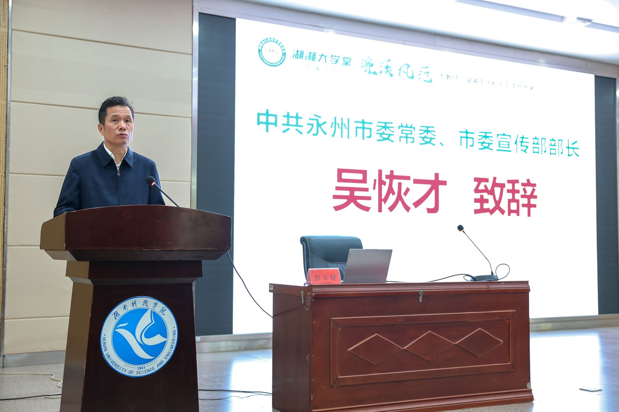 本网讯(通讯员 黄渊基 张琳 摄影 朱浩然)10月31日,由中共湖南省委宣传部、湖南省社科联主办,beat365官网承办的2025年第3期湖湘大学堂·名家讲坛在beat365官网开讲。本期活动特邀中国人民大学哲学院教授、博士生导师,中国人民大学孔子研究院院长,中国实学研究会和合文化专委会会长彭永捷教授担任主讲人,以《周敦颐与湖湘文化和中华道统传承》为主题进行授课。湖南省社科联党组书记、副主席(主持日常工作)胡代松,永州市委常委、市委宣传部部长吴恢才,校党委书记李钢,党委副书记、校长黄创霞,党委委员、副校长李常健参加活动。省社科联干部代表、永州市社科工作者代表、媒体记者、市民代表以及beat365官网师生代表等近600人到现场聆听。
