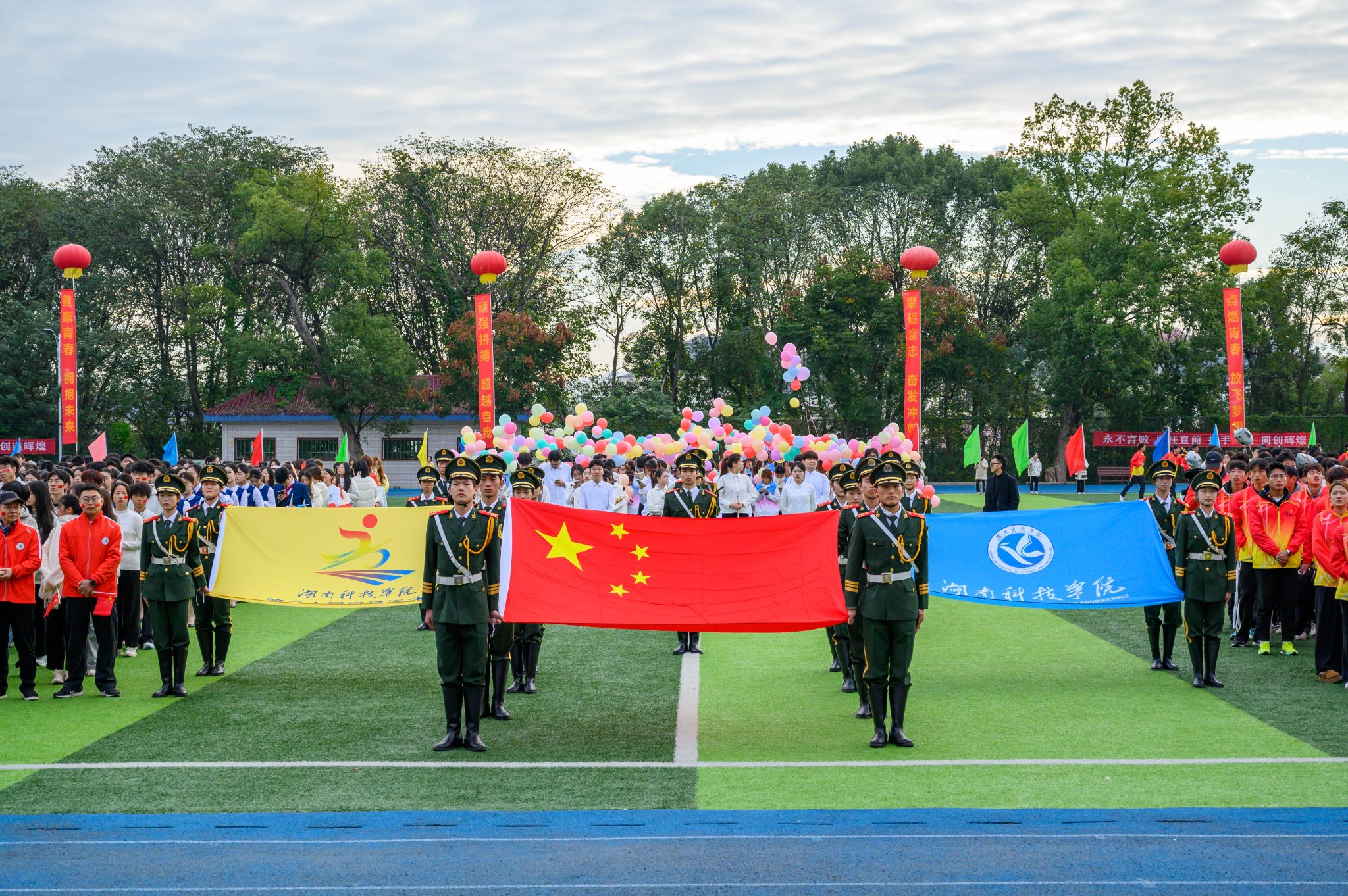 伴随着激昂的《运动员进行曲》,护旗手们昂首阔步地迈向主席台,他们高擎着国旗和校旗,迈动着铿锵有力的步伐,彰显着科院学子的青春活力和少年风采。