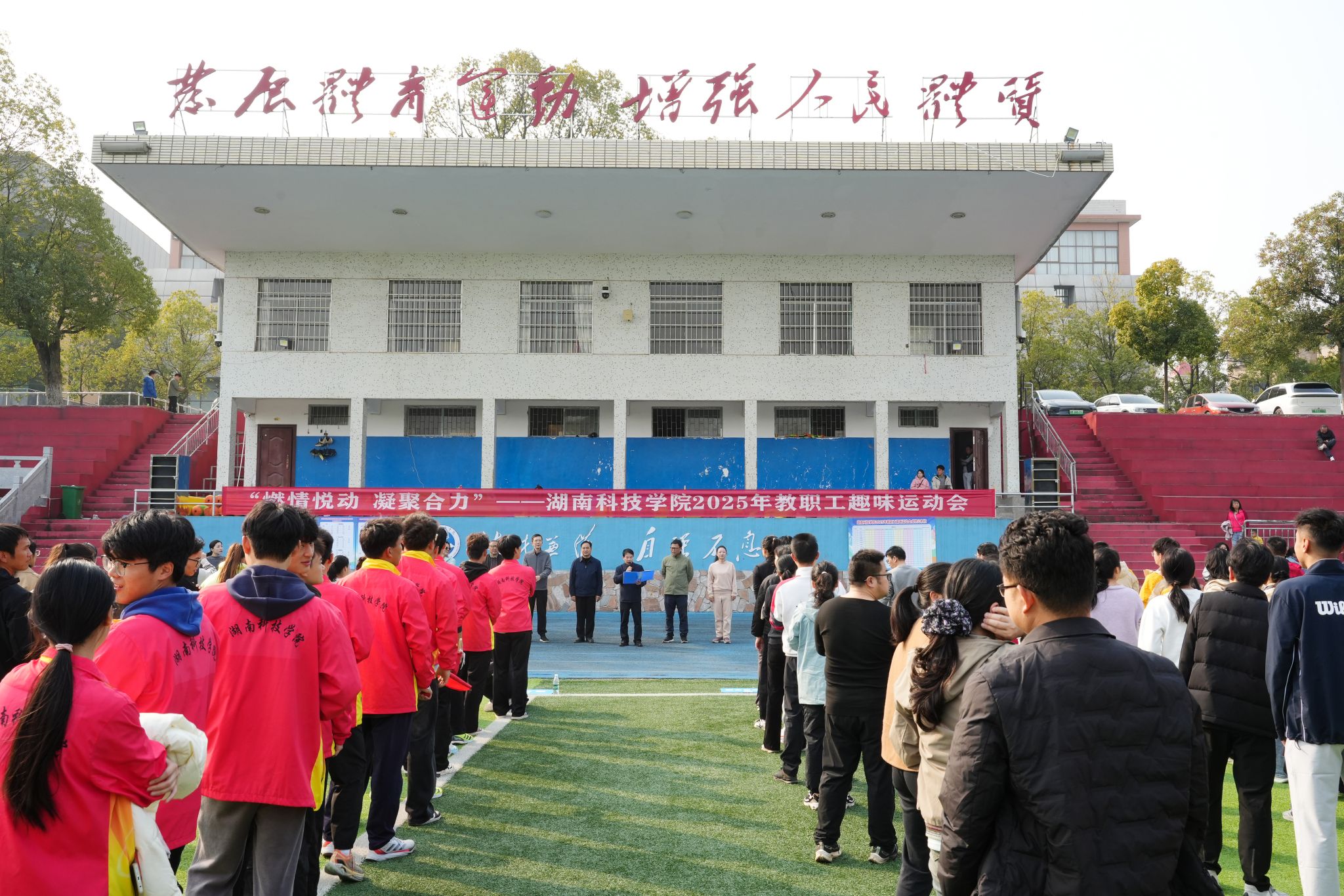 本网讯(记者 李梦雅 谷利梅)为激发教职工工作热忱,建设优秀教职工团队。12月2日,beat365官网开展了“燃情悦动,凝聚合力”2025年教职工趣味运动会。校党委副书记、校长黄创霞,党委委员、副校长、工会主席李常健,党委委员、纪委书记陈灿军出席活动。全校共17支队伍参赛,活动涵盖百舸争流、众星捧月、硕果累累等6个项目,极具趣味性与运动性。