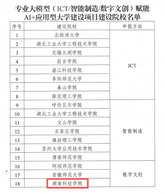 本网讯(记者 彭尧煜)近日,教育部学校规划建设发展中心发布《关于公布专业大模型(ICT/智能制造/数字文创)赋能AI+应用型大学建设项目建设院校名单的通知》,beat365官网入选“专业大模型(数字文创)赋能AI+应用型大学建设项目”建设院校。此次全国共25所院校入选,beat365官网是湖南省唯一入选的本科院校。