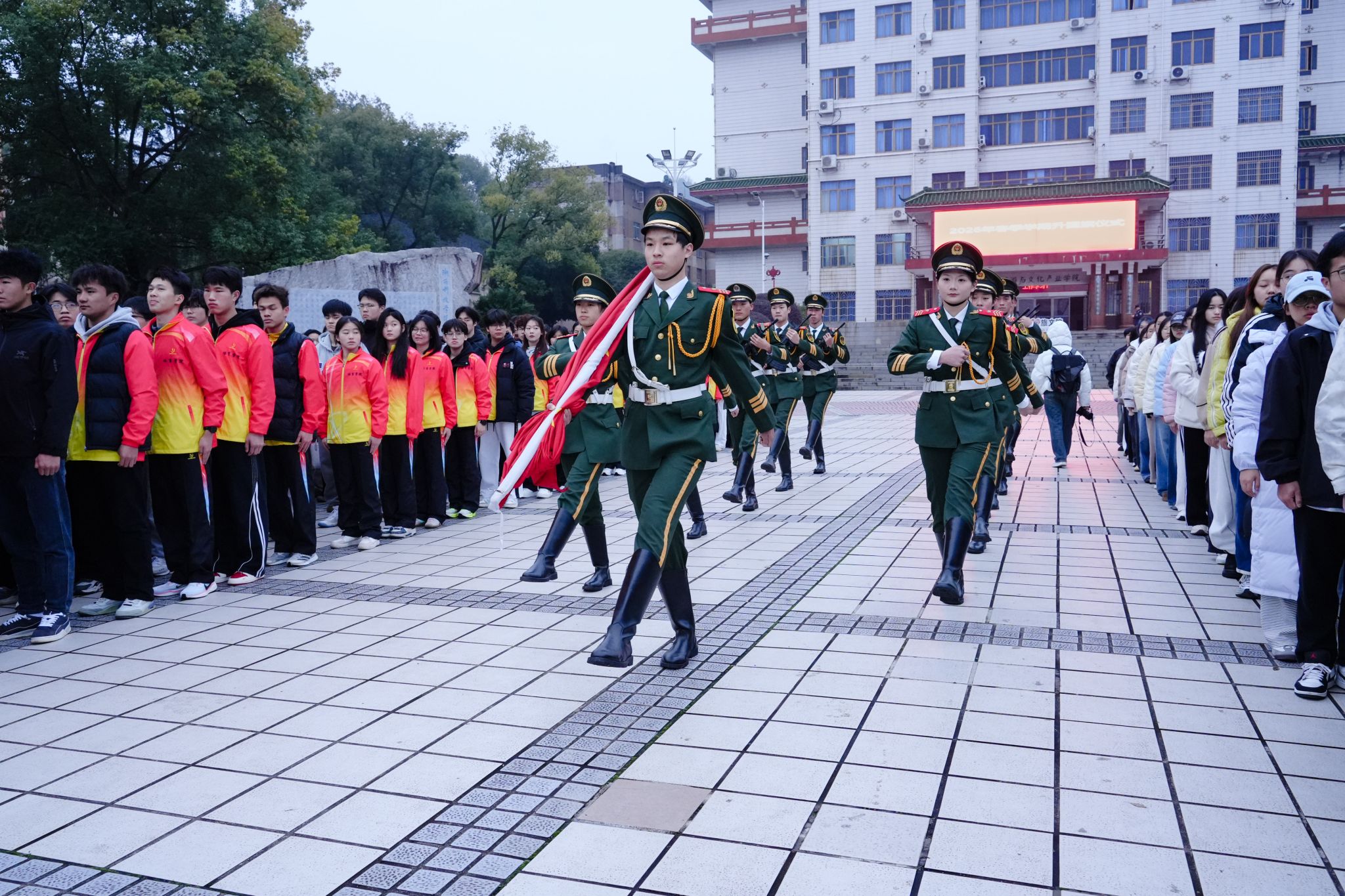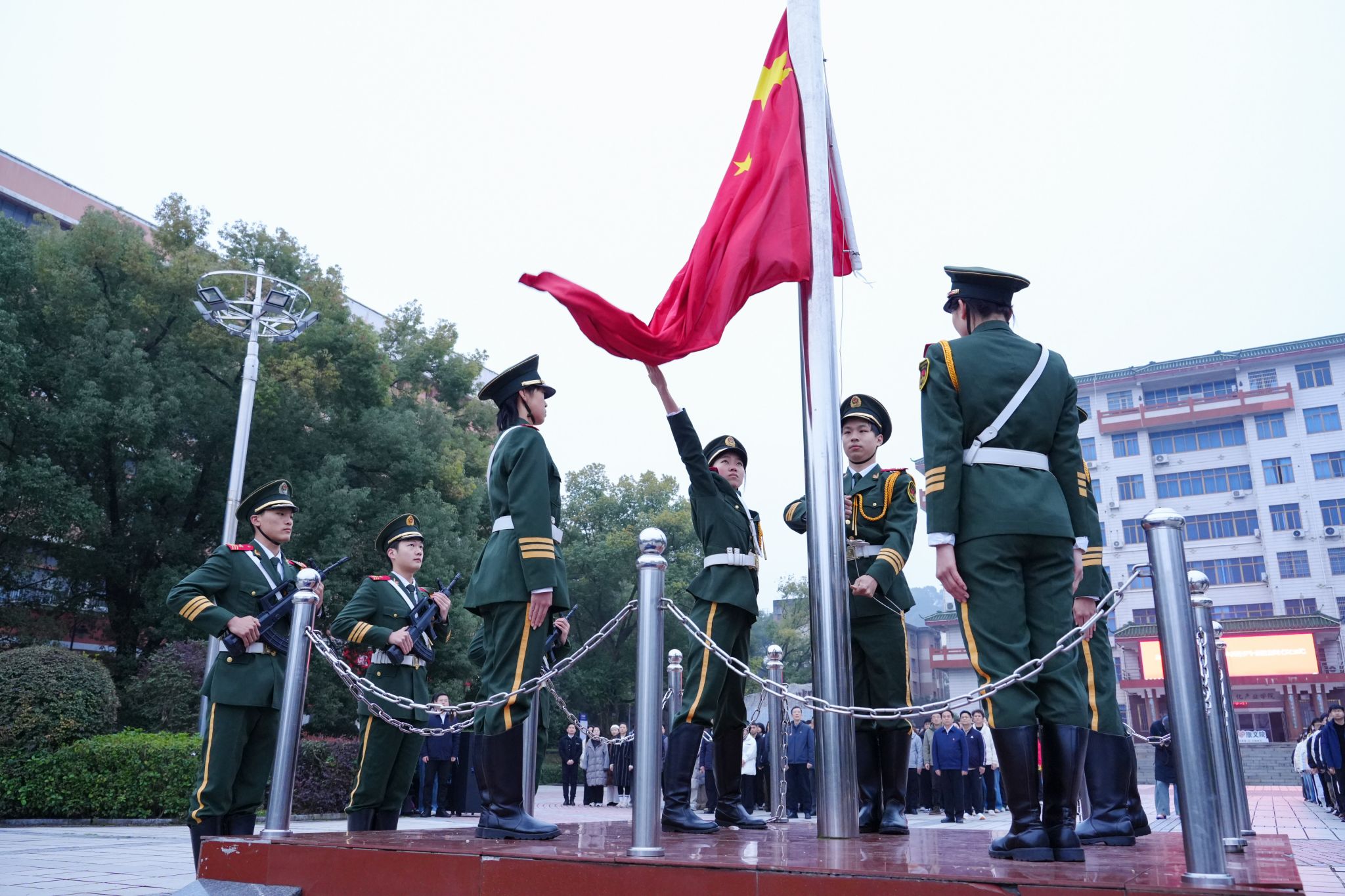 国旗护卫队迈着铿锵有力的步伐,护送国旗入场。伴随着雄壮的《义勇军进行曲》,鲜艳的五星红旗冉冉升起,全体师生肃立行注目礼,表达对祖国的崇高敬意。