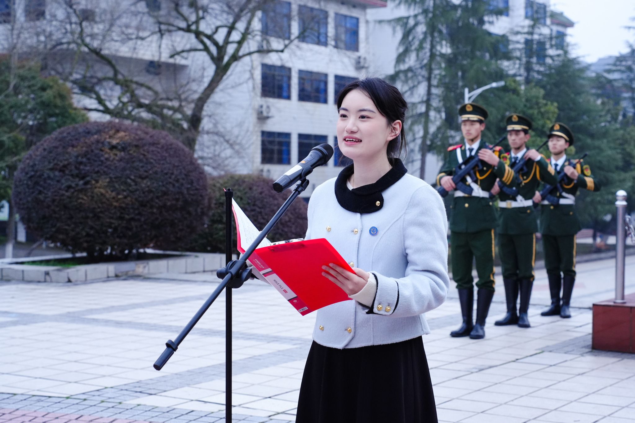 学生代表、理学院数学与应用数学专业2302班吴宜超同学以《争做自己人生的掌舵者》为题进行发言。她分享了自己在专业学习、学科竞赛中的拼搏历程,号召同学们以热忱为帆、以执着为桨、以担当为舵,在奋斗中书写青春华章,让青春在国旗下绽放光芒。