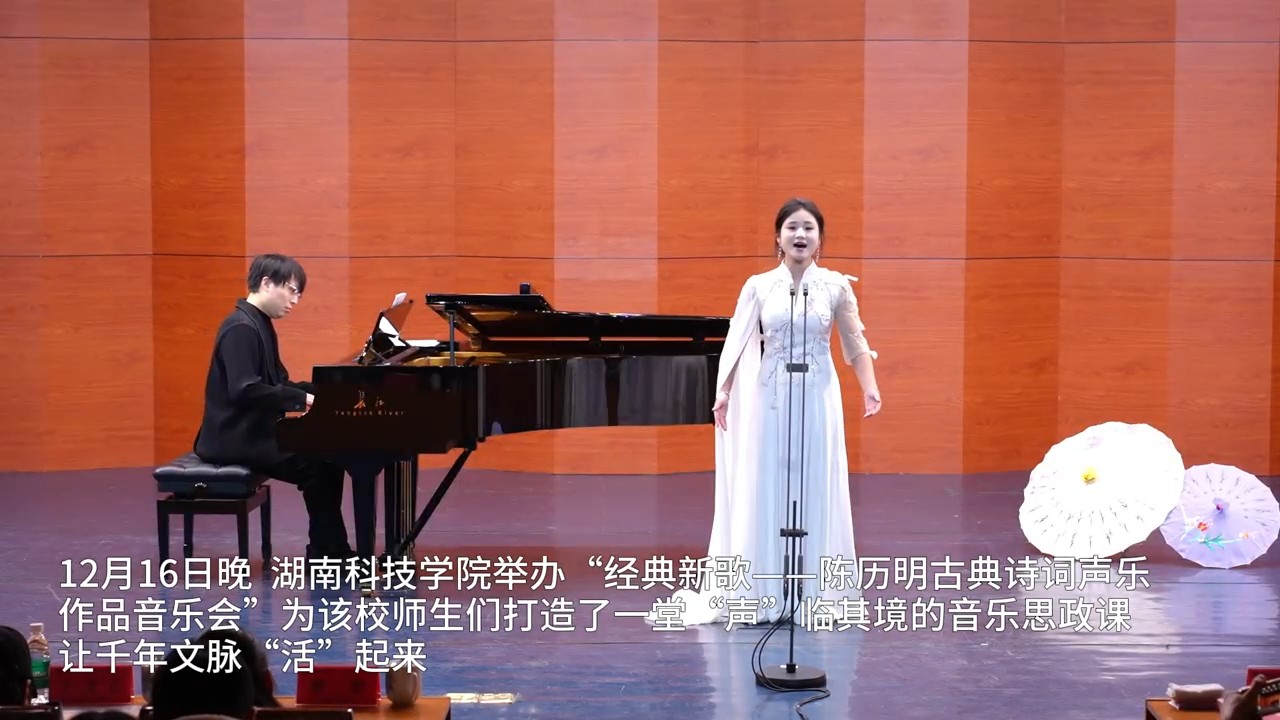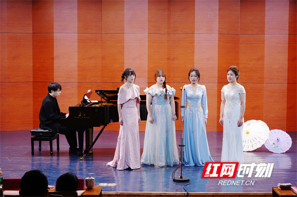 音乐会现场,从柳宗元谪居永州时写下的《零陵早春》和《渔翁》,到气壮山河的《满江红》,以及理学开山周敦颐的散文《爱莲说》,精心筛选的19首曲目全部由在读大学生担纲演唱。这种强烈的“沉浸感”与“代入感”,让传统文化变成“耳畔的旋律”。“歌声像一座桥,让我直接走进了诗人的情感世界里。”财管2401班学生谷利梅在观演后说。