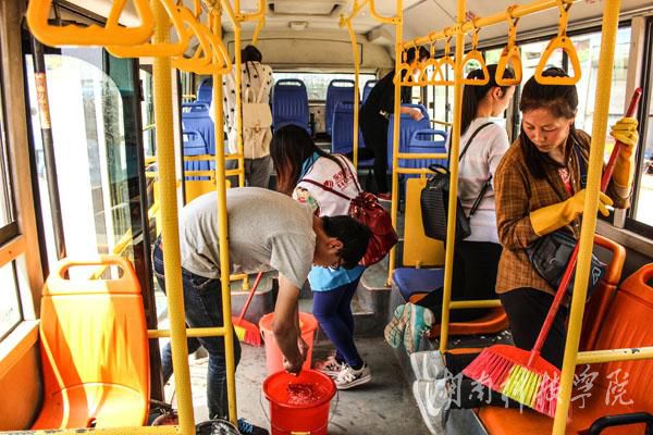 志愿者们分成两组,一组负责清洗公交车身,另一组负责清洗车厢。每一辆公交车进站停稳后,志愿者们立即进入车厢分头行动,男生提水、扫地、拖地,女生擦洗栏杆、扶手和车窗,不放过座椅下任何一个死角。每清洗完一辆公交车后,志愿者们就会把他们制作好的文明标语贴在公交车最显眼的地方,提醒广大乘客讲文明树新风。