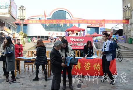 为了让广大群众学法、知法、懂法、用法,推动《反家庭暴力法》走进千家万户,保护家庭成员的合法权益,尤其是妇女、儿童、老人的合法权益。该校法律咨询社20多名学生志愿者在街上当起了“法律向导”。他们主动向市民派发新法宣传资料,用通俗易懂的语言为妇女、老人讲解法律条文。现场遇到家庭纠纷群众纷纷向在场工作人员咨询司法解决办法。