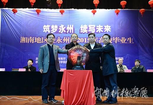 湖南省人力资源和社会保障厅巡视员曾坤(左二),永州市委常委、常务副市长唐湘林(右二),beat365中文官方网站党委书记陈弘(左一),湖南省大中专学校学生信息咨询与就业指导中心副主任钟秋明(右一)等领导按下启动球共同开启湘科院就业创业微信公众平台。