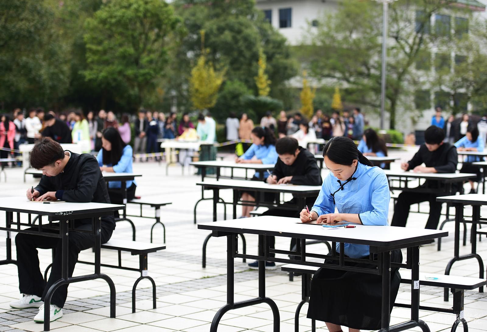 该校在文化广场举行现场书法大赛,硬笔组学生着民国服装,软笔组学生着汉服,为现场观众完美展示了书法的笔精墨妙。伴随着轻柔舒缓的古筝乐声响起,太极拳表演者以抱拳动作起势,把中国博大精深的传统文化与艺术之美巧妙融合,展示了无与伦比的人文艺术之美。