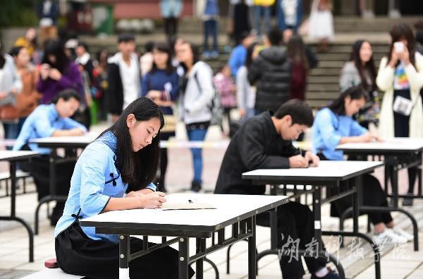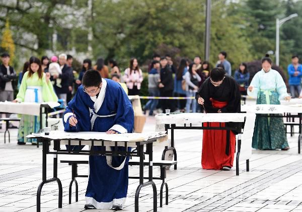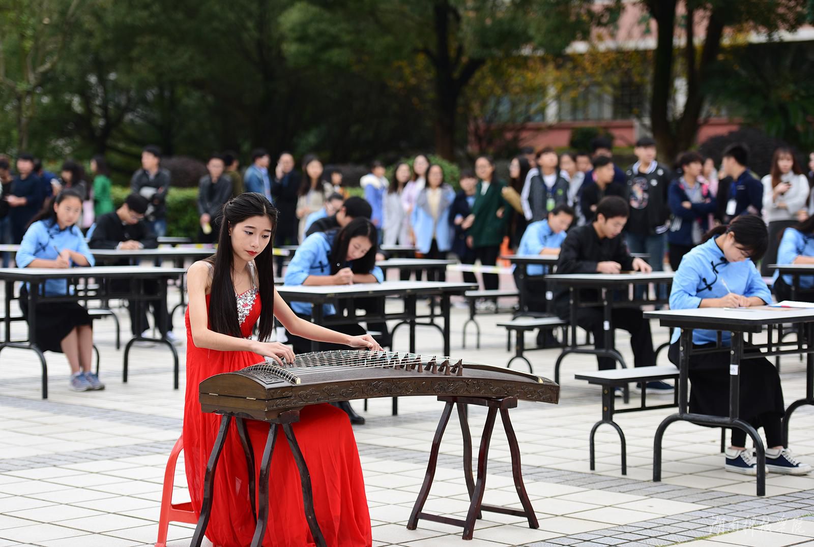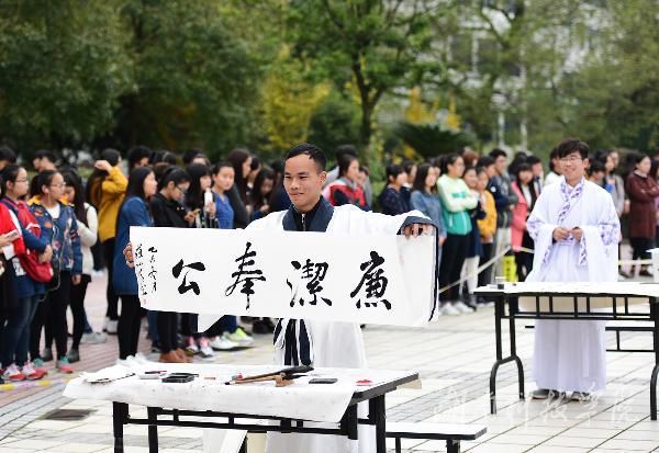 本网讯 挥毫遒劲书正气, 翰墨飘香展清廉。11月22日,beat365中文官方网站近千名师生陶醉在悠扬婉转的古筝声中,欣赏了一场学子着汉服、民国服装现场挥毫泼墨的弘扬传统文化的视觉盛宴。