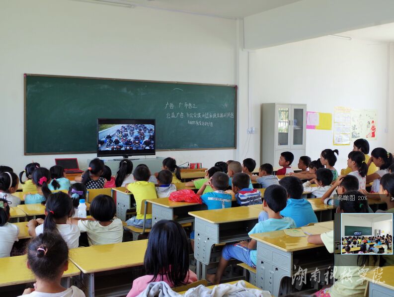 由于生长在偏远的农村地区,松柏瑶族乡的大多数孩子没有接受到网络等新媒体的熏陶。服务团希望在这一周通过多样化的教学模式带给孩子们更多新知识和新感受。志愿者们选取了一些央视社会主义核心价值观公益广告视频,希望带给孩子们一些启迪,为孩子们传播向上向善的正能量。没有多媒体,没有音响,志愿者用学校里仅有的一台40英寸的电视机当做显示屏,通过连接笔记本电脑,为学生播放视频,观看完《再一次 为平凡人喝彩》后,志愿者告诉学生“我们都是平凡人,但我们仍旧可以过得不平凡,每一个平凡人的默默付出便可构成大千世界的五彩斑澜!”带动了学生们进行积极思考。