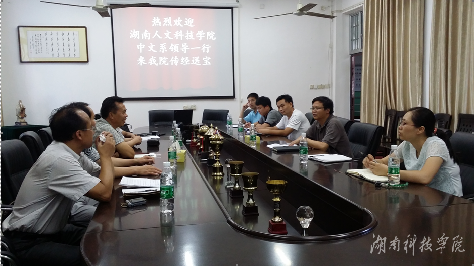 本网讯 8月5日上午,湖南人文科技学院中文系一行五人在系主任李夫泽、党总支书记王立平教授带领下到访beat365官网人文与社会科学学院,与该院院长潘雁飞及在家的副书记、副院长,中文系、秘书学系负责人共同探讨交流二级院系“十三五”规划和转型发展等办学问题。