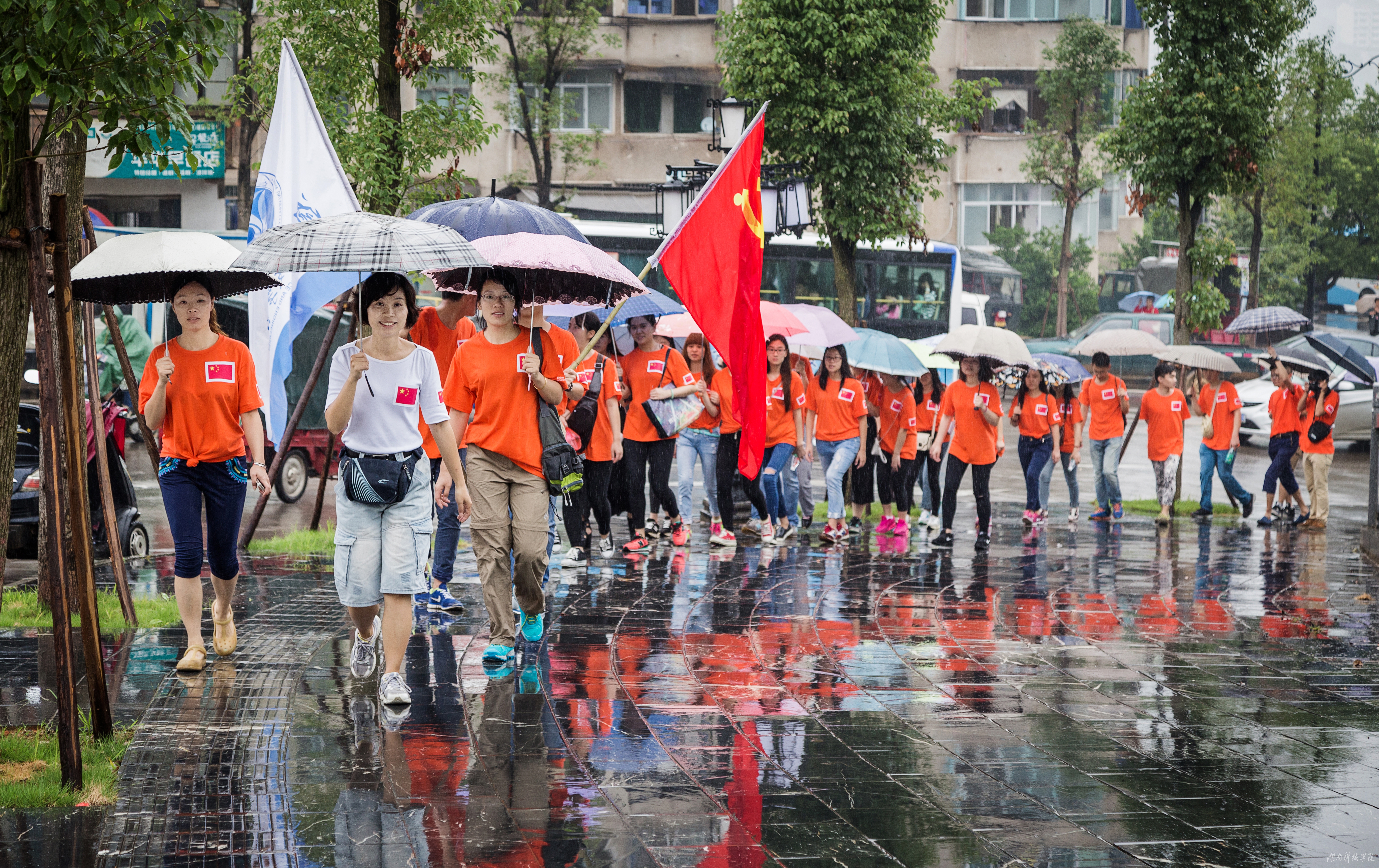 毅行途中雨越下越大,但党员师生热情高涨,互帮互助,一路欢歌笑语,最终顺利到达活动的目的地。