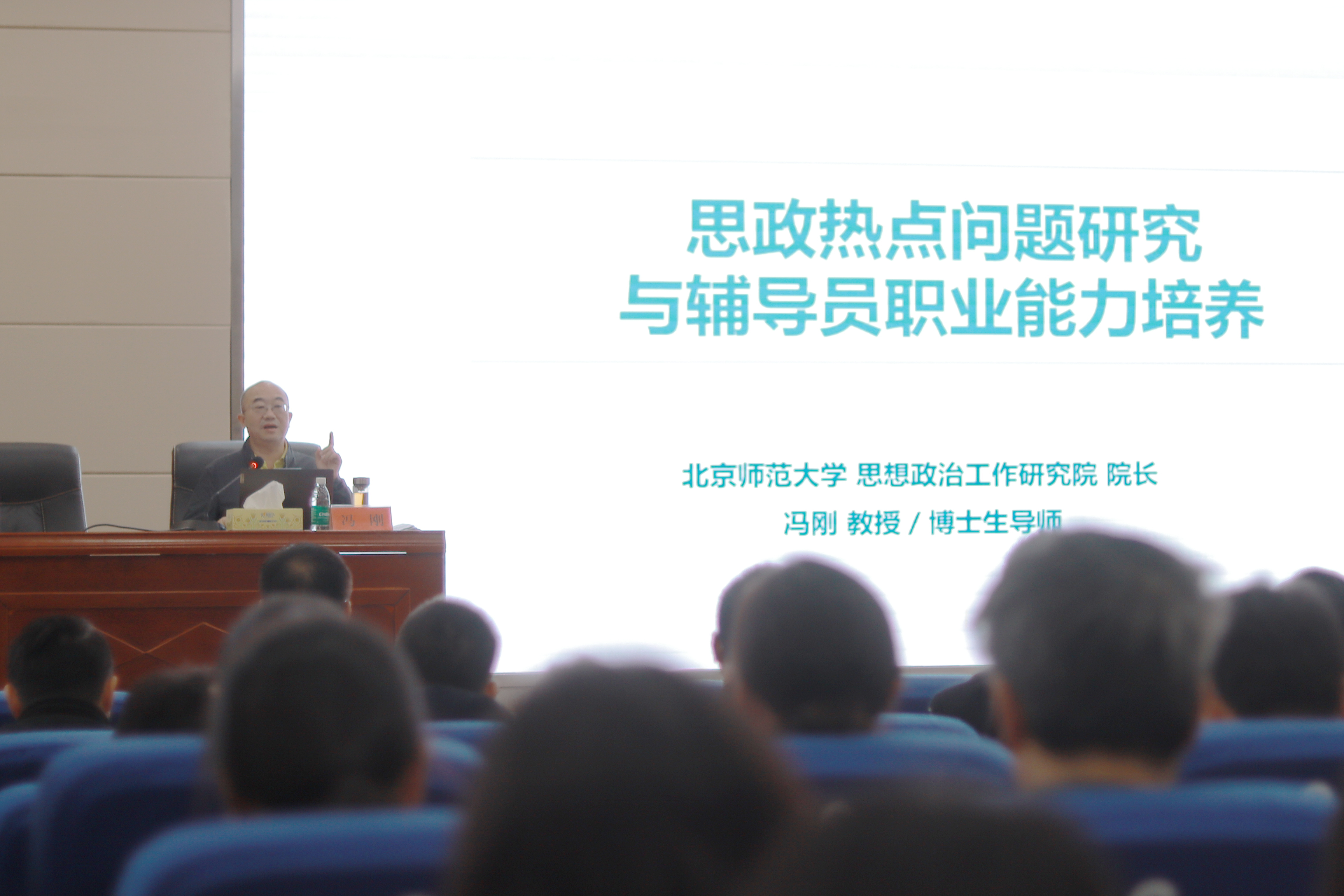 本网讯(记者 康恩瑶)为深入学习贯彻落实习近平新时代中国特色社会主义思想和党的二十大精神,落实习近平总书记关于教育的重要论述和全国高校思想政治工作会议、全国教育大会精神,4月24日上午,北京师范大学思想政治工作研究院院长、教授、博士生导师,原教育部思想政治工作司司长冯刚应邀来校作专题辅导报告。