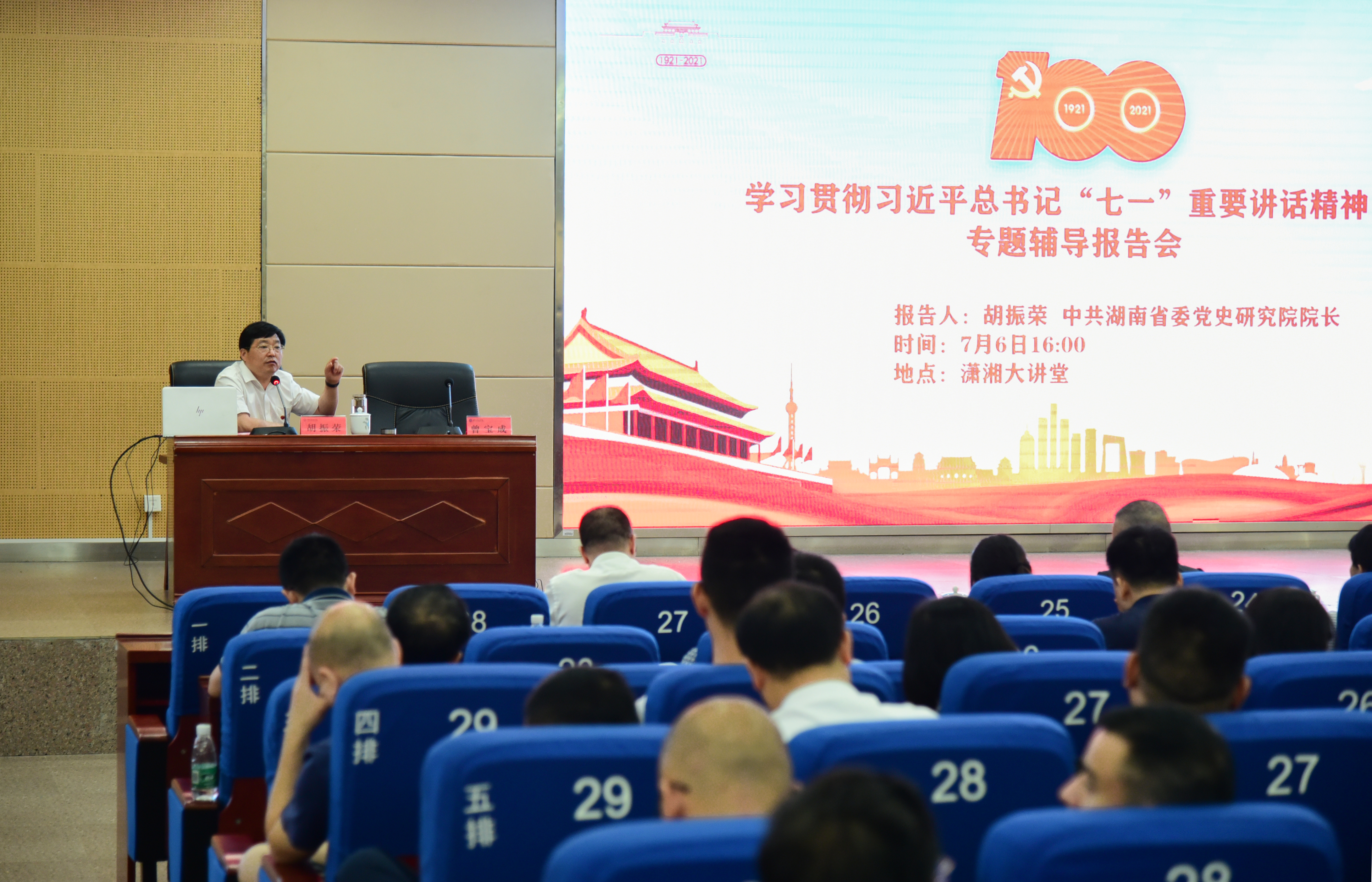 本网讯 7月6日下午,学校举行学习贯彻习近平总书记“七一”重要讲话精神专题辅导报告会。中共湖南省委党史研究院院长胡振荣应邀来校作专题辅导。省委党史研究院综合部主任、一级调研员刘文典,市委党史研究室主任李祥红,新田县委副书记易先平,在家校领导及师生党员代表600余人聆听专题辅导报告。校党委书记曾宝成主持报告会。
