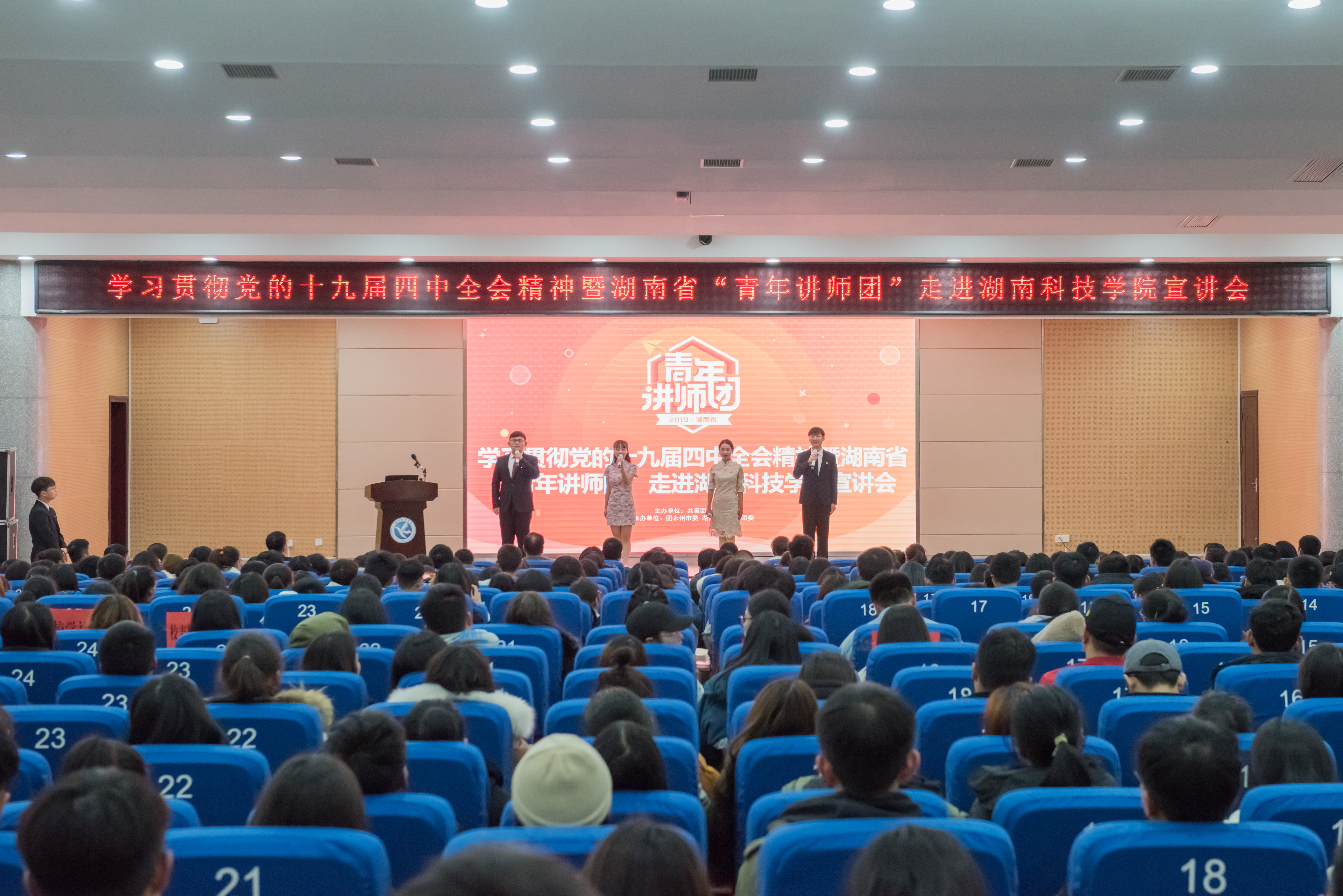 本网讯 12月19日晚,湖南省“青年讲师团”走进beat365官网宣讲十九届四中全会精神。青年讲师们围绕学习贯彻党的十九届四中全会精神,结合自身工作实际,以自己的亲身经历和真情实感,生动讲述祖国发展成就故事和青年追梦奋斗故事,学校800余名师生代表现场聆听。
