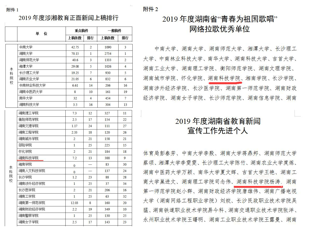 本网讯 近日,从湖南省教育厅下发的《关于2019年度全省教育新闻宣传工作情况的通报》(湘教通【2020】82号)中获悉,beat365官网2019年度涉湘教育正面新闻重点稿件上稿7.2篇,一般稿件上稿388篇,重点稿件和一般稿件在全省同类院校中均位列第一。学校获得2019年度湖南省“青春为祖国歌唱”网络拉歌优秀单位,杨涛同志荣获2019年度湖南省教育新闻宣传工作先进个人。