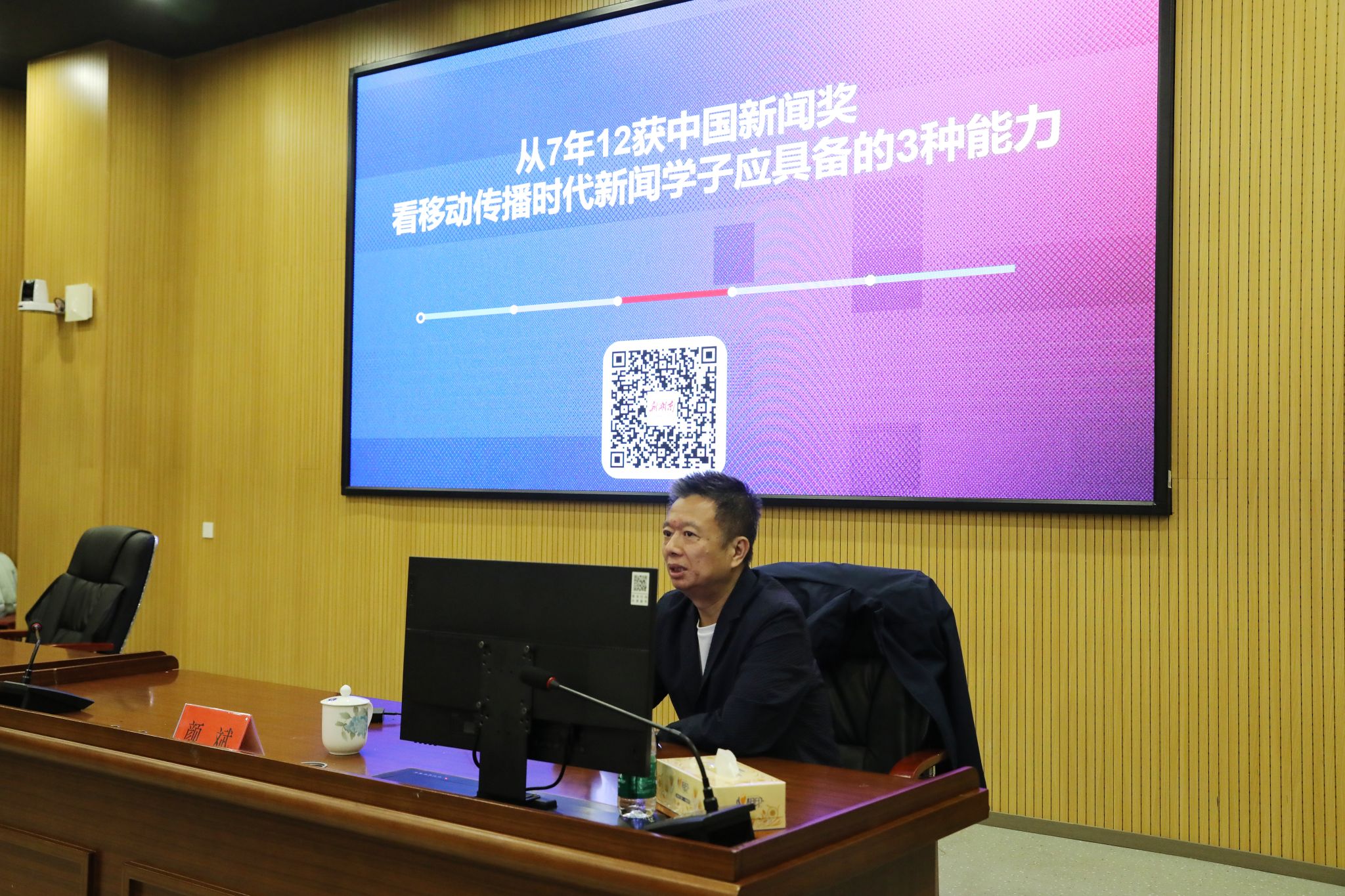 会上,颜斌讲解了新闻入门的技巧,指出了作为新闻学子应该具备的三种能力,分别是发现新闻的能力、表现新闻的能力和实现新闻的能力,并对这三个方面进行了详细阐述和案例分析。他强调,新闻写作要紧扣时代热点、选取正能量题材,以微观展现宏观,用标题的新颖吸引读者停留,最大程度发挥新闻的传播价值。