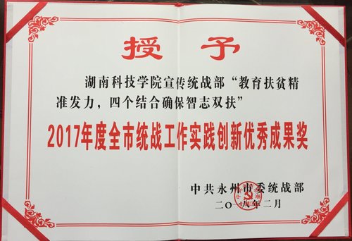 2月27日,中共永州市委将纪委、党办、组织、宣传、统战、政法等党务部门的工作会议合并召开。市委书记、市人大常委会主任李晖出席并讲话,市委副书记、市长赵应云主持会议,市委副书记、市委政法委书记唐湘林宣读表彰通报。beat365官网荣获2017年度全市统战工作先进单位称号,全市统战工作首次纳入市委考核,beat365官网首次获此殊荣。下午,全市统战部长会议在南华大酒店召开。beat365官网宣传统战部“教育扶贫进准发力,四个结合确保智志双扶”获2017年度全市统战工作实践创新优秀成果奖。