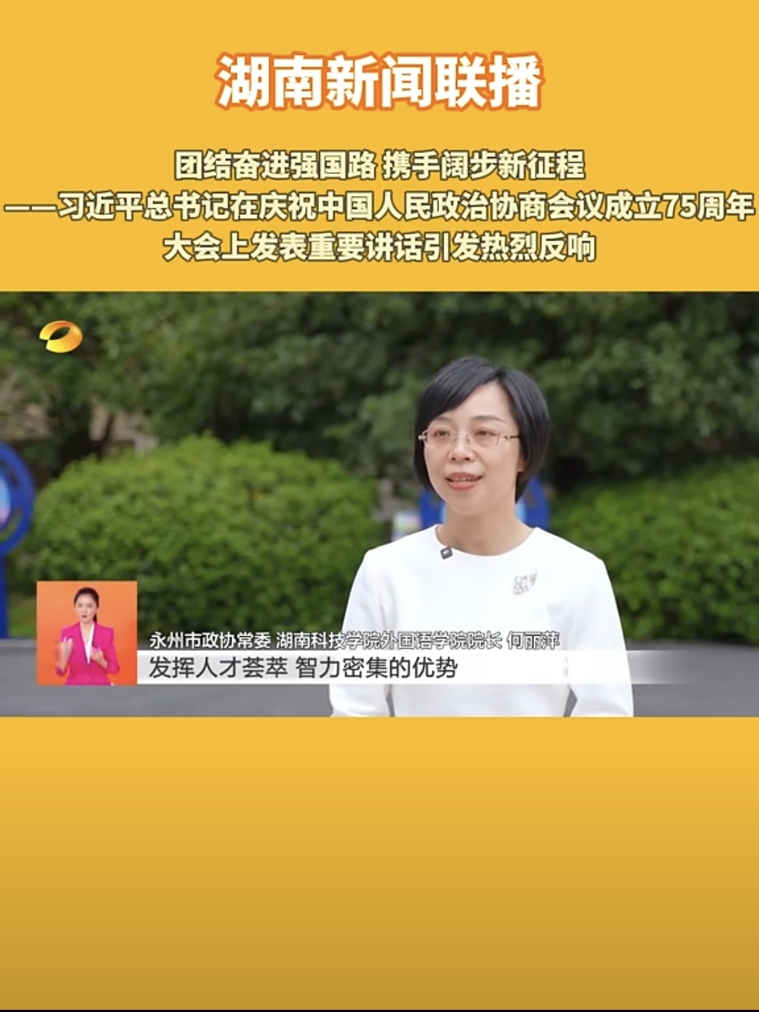 本网讯(通讯员 李焕品)9月20日,湖南卫视新闻联播播出的《团结奋进强国路 携手阔步新征程——习近平在庆祝中国人民政治协商会议成立75周年大会上发表重要讲话,引发热烈反响》节目中,湖南省政协委员、永州市政协常委、beat365官网民进支部主委、外国语学院院长何丽萍在接受采访时讲到:“发挥人才荟萃、智力密集的优势,聚焦推进中国式现代化,进一步全面深化改革,深入推进协商议政。”