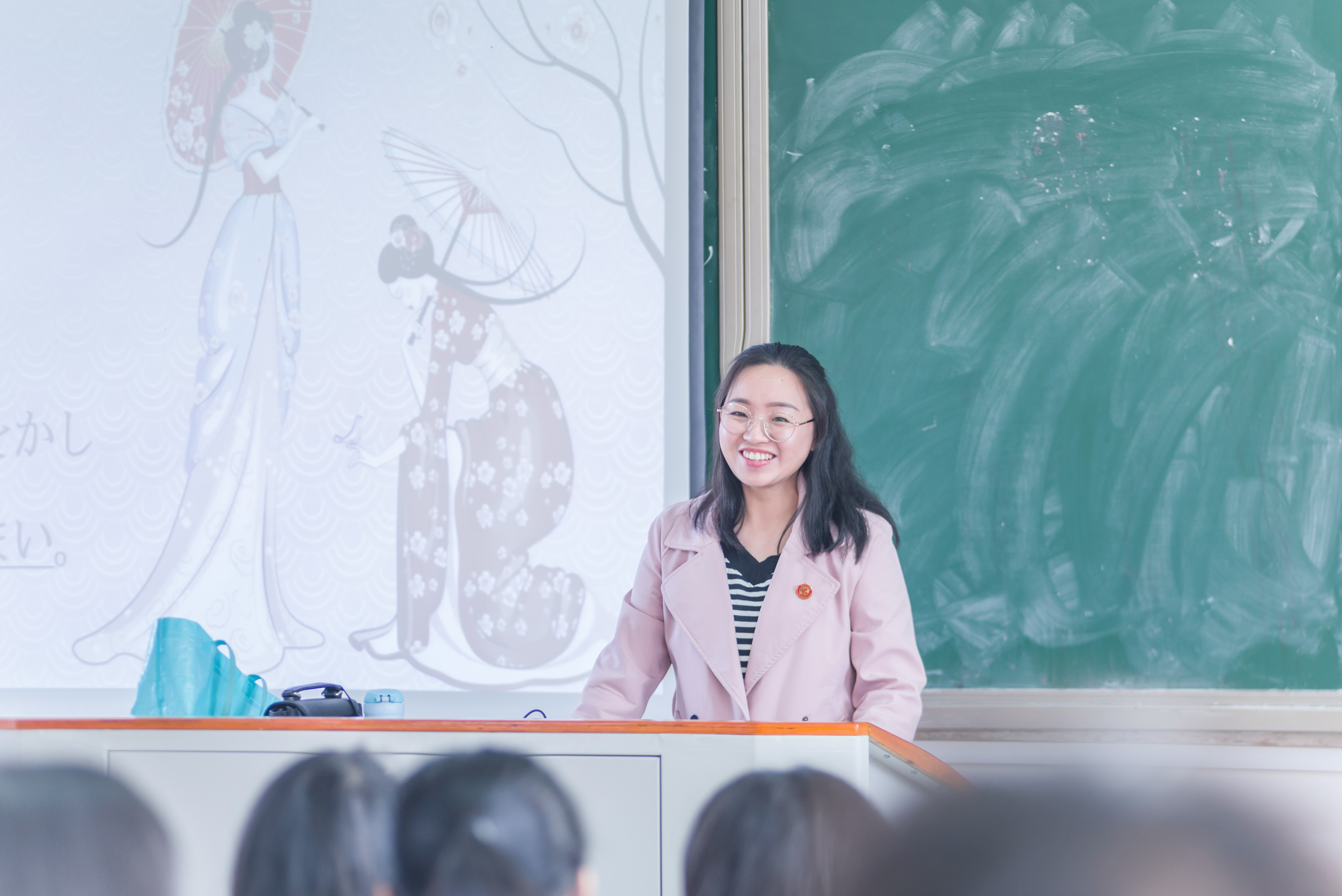 教学是一门技术,更是一门艺术。彭璐六年的从教之路,凭着自己敢于探索的执着和热情,一点点聚集起教学艺术带来的光华。其实,刚成为教师的彭璐也曾按部就班,循规蹈矩地给同学们上课,毕竟是语言课老师,她用常规学习英语的办法给同学们布置日语任务:背诵,默写,造句,以此来达到辅助学生扎实基础的目的。但很快她便在积极性不高的反馈中发现了自己课堂的问题,语言的魅力明明在于它的变化万千,它的神秘,它的情绪起伏,这样每天机械的背诵读写却让同学们完全失去了对学习日语的激情,也违背了彭璐教学的初衷。于是她开始鼓励同学们在上课的时候尽量选择新“同桌”或新“邻居”,每天去跟不同的人练习对话,尝试靠自己的日语能力去和“陌生人”沟通,同学们从一开始的拘谨和尴尬,慢慢开始接受这样的设定,到现在享受了解一个人的过程,这样的转变也让他们开始直观的感受到语言的神奇。是不设防的语言沟通让他们可以更加自在的分享与交流,也更加客观的指出对方的毛病,甚至还能制造独属于两个人的小秘密。“在璐姐的课堂上,一丝不苟中伴随着幽默风趣,温柔中带着不可亵渎的威严,她的课总能带给我们一些小欢乐,让我们在枯燥的学习中获得满满的幸福感。”日语1701班谭琴琴如是说。
