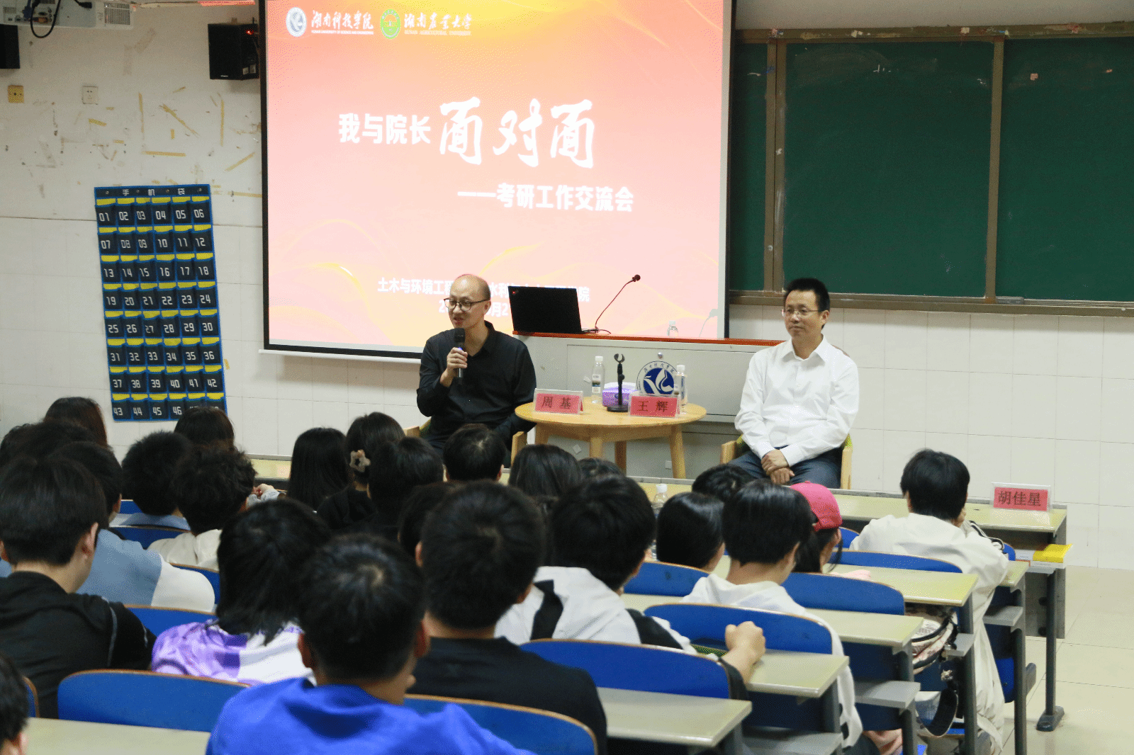 本网讯(通讯员 罗琅贵 麦合丽娅) 10月21日,为帮助学生更好的了解考研形势,明确考研目标,土木与环境工程学院在逸夫楼218教室举行考研交流会。湖南农业大学水利与土木工程学院院长王辉、学院院长周基、副院长胡佳星出席,辅导员潘艳丽、2022级学生参加。