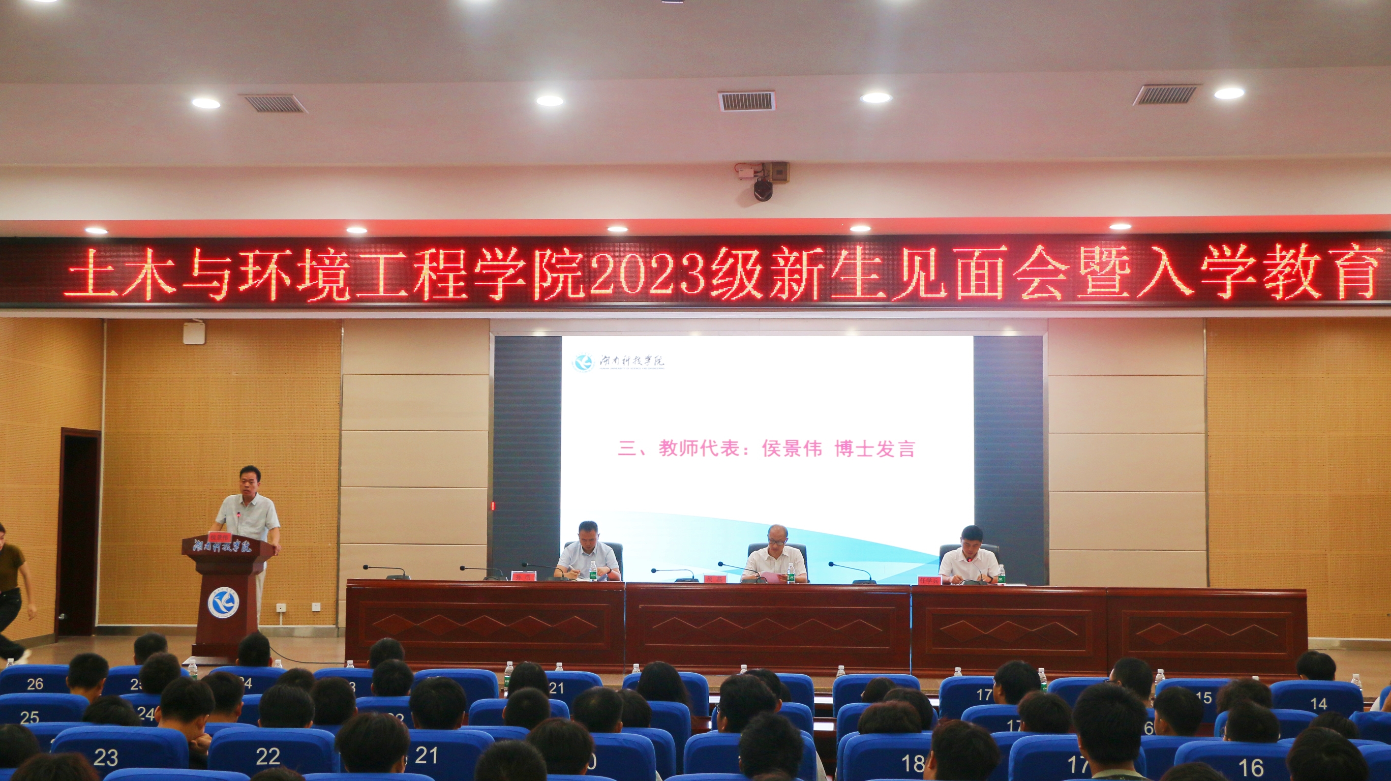 (通讯员:付晋晶) 9月23日19点,我院在潇湘大讲堂举行2023级新生见面会暨入学教育。院长周基、党总支副书记任学兵、副院长孙明、2023级辅导员、班主任出席,全体新生参加,会议由任学兵主持。 周基发表致辞,代表土环院对新生的加入表示热烈欢迎,并希望同学们要树立正确的世界观和人生观,要不断学习,并能够学会思考,为社会发展作出新贡献。教师代表候景伟,结合实际问题就如何学会自律自强,希望同学们能够以学立身。老生代表土木2001班周余玺结合自己的大学经历,鼓励同学们用坚持与付出来充实和锻炼自我。新生代表建筑2302班邵帅表达了对大学生活的憧憬,号召当代青年应该以学习来充实自己。任学兵为2023级新生进行入学教育,重点讲了安全教育和日常管理,希望同学们珍惜青春、不负韶华,并在现场就学生提出的问题给予回复。 大学,对新生来说是一次新的启程。此次新生见面会的成功召开,不仅增进新生对我院的了解,为同学们制定未来规划指明了方向,也有利于推动我院的发展再上新台阶。