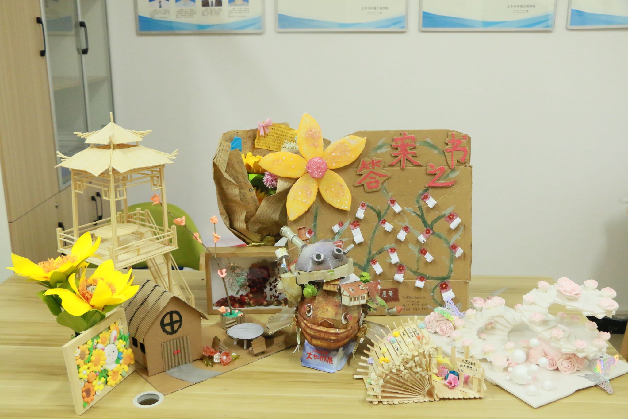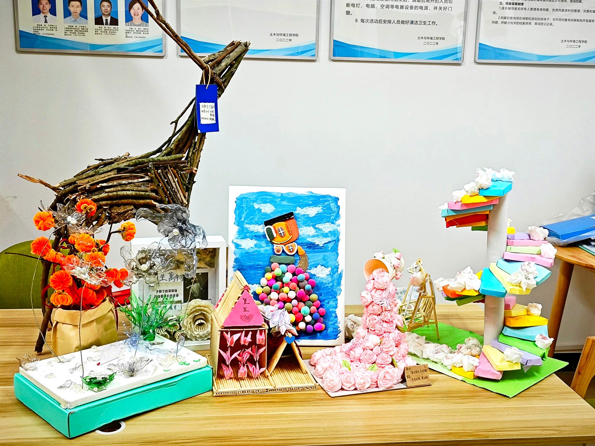 一等奖作品 活动期间,收到了来自全校800多份参赛作品,作品形式丰富多样,原创性强,内容积极向上,同学们还充分利用了身边和大自然中的材料如塑料瓶、快递纸盒、树枝枯叶等,同学们认真创作,化平凡为神奇,通过手工制作的方式展现出内心美好的期待。经过严格评选,产生一等奖6名、二等奖8名、三等奖10名、优秀奖30名。