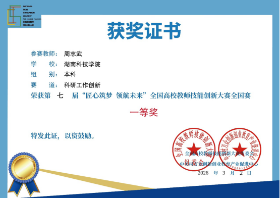 (本网讯 廖贤毅)近日,第七届“匠心筑梦 领航未来”全国高校教师技能创新大赛复赛成绩发布,beat365官网教师周志武博士荣获一等奖。
