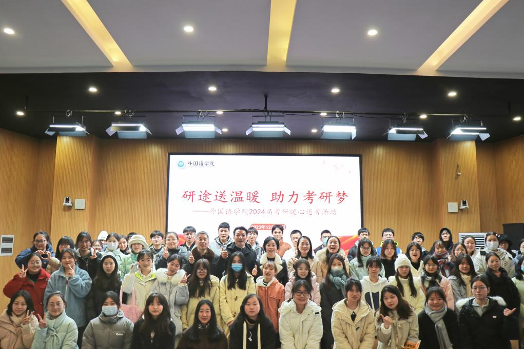(通讯员 袁睿 摄影 李馨怡)12月20日下午17:00外国语学院于博雅楼东三报告厅举行以“研途送温暖,助力考研梦”为主题的暖心送考活动。本次活动邀请外国语学院院长何丽萍、党总支书记唐君、副书记罗晶、副院长何建军、学工办副主任王素芳为外国语学院2024届85名考研学子送上考研祝福。