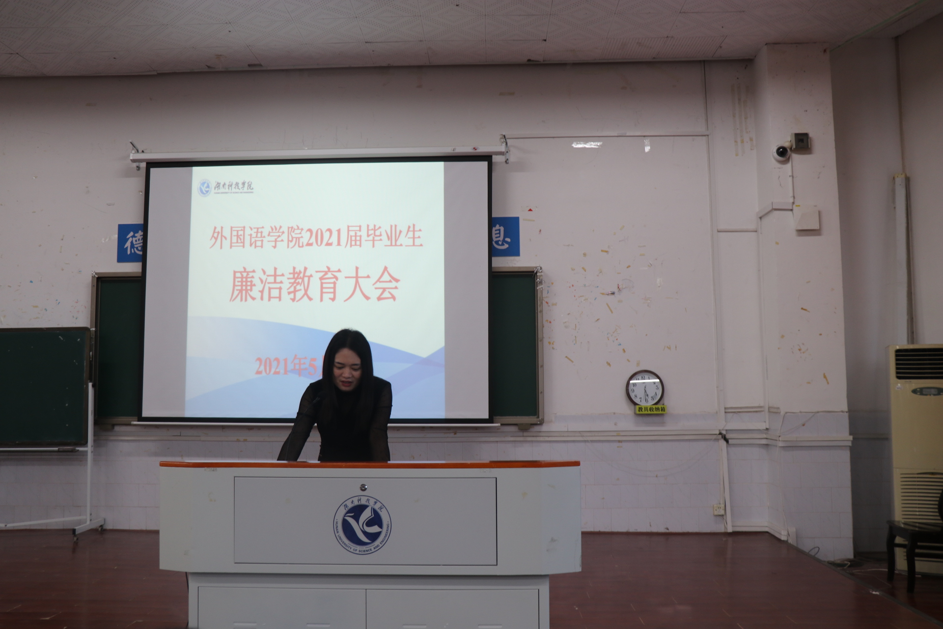 本网讯(通讯员 肖敏;摄影 田金凤)5月27日上午,外国语院在博雅楼东三召开2021届毕业生廉洁教育大会。外国语学院院长欧华恩、党总支书记张剑、党总支副书记罗晶、毕业班班主任以及全体在校毕业生共同与会,会议由学工办副主任、2017级辅导员刘罗主持。