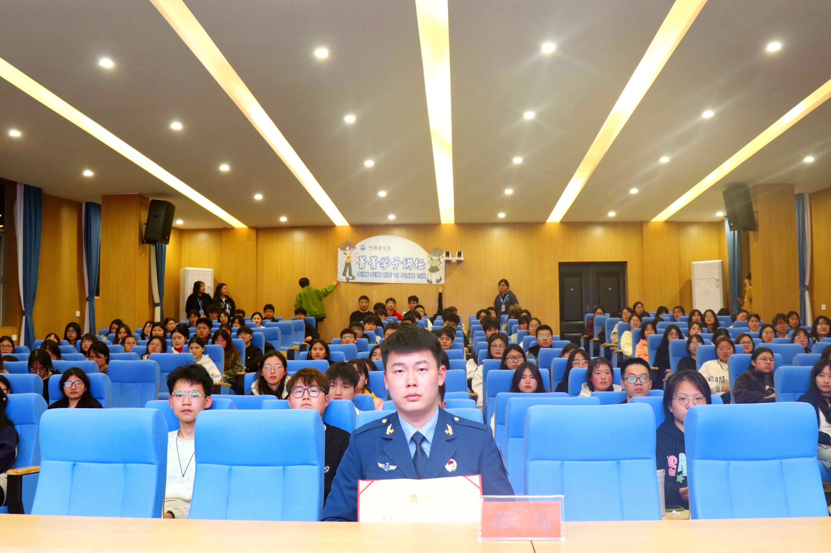 本网讯(通讯员 蔡卓 江映稼 摄影 袁睿)3月22日晚,外国语学院于博雅楼东三报告厅举办以“风华正茂书壮志,参军报国正当时”为主题的第九十四期菁菁学子讲坛。本次活动邀请到商务英语2002班蒋力主讲。全院共有200多名同学参与讲座。