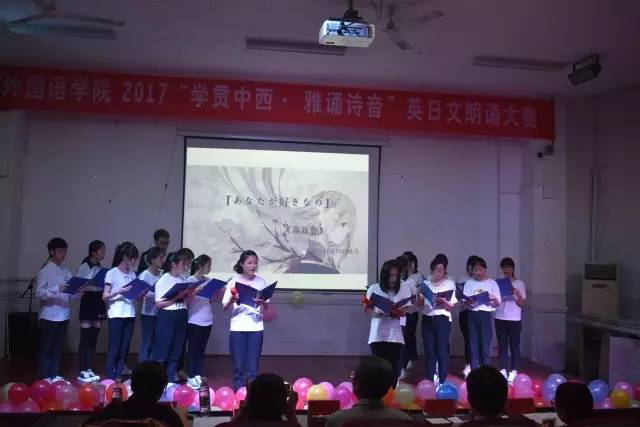 在本次比赛中,各组选手不仅展现了高超的专业水平,而且充分发挥创新精神,在传统朗诵的形式上融入了舞蹈、歌曲等新的元素,让比赛更加精彩。其中来自英语1605班的李家琪组深情并茂的朗诵了《Think it over》,赢得了全场观众的掌声,而英语1502班全体的合诵则把比赛气氛推向了高潮。 这次比赛旨在强化学生所学英日文知识,扩展学生知识面,锻炼学生口语能力。