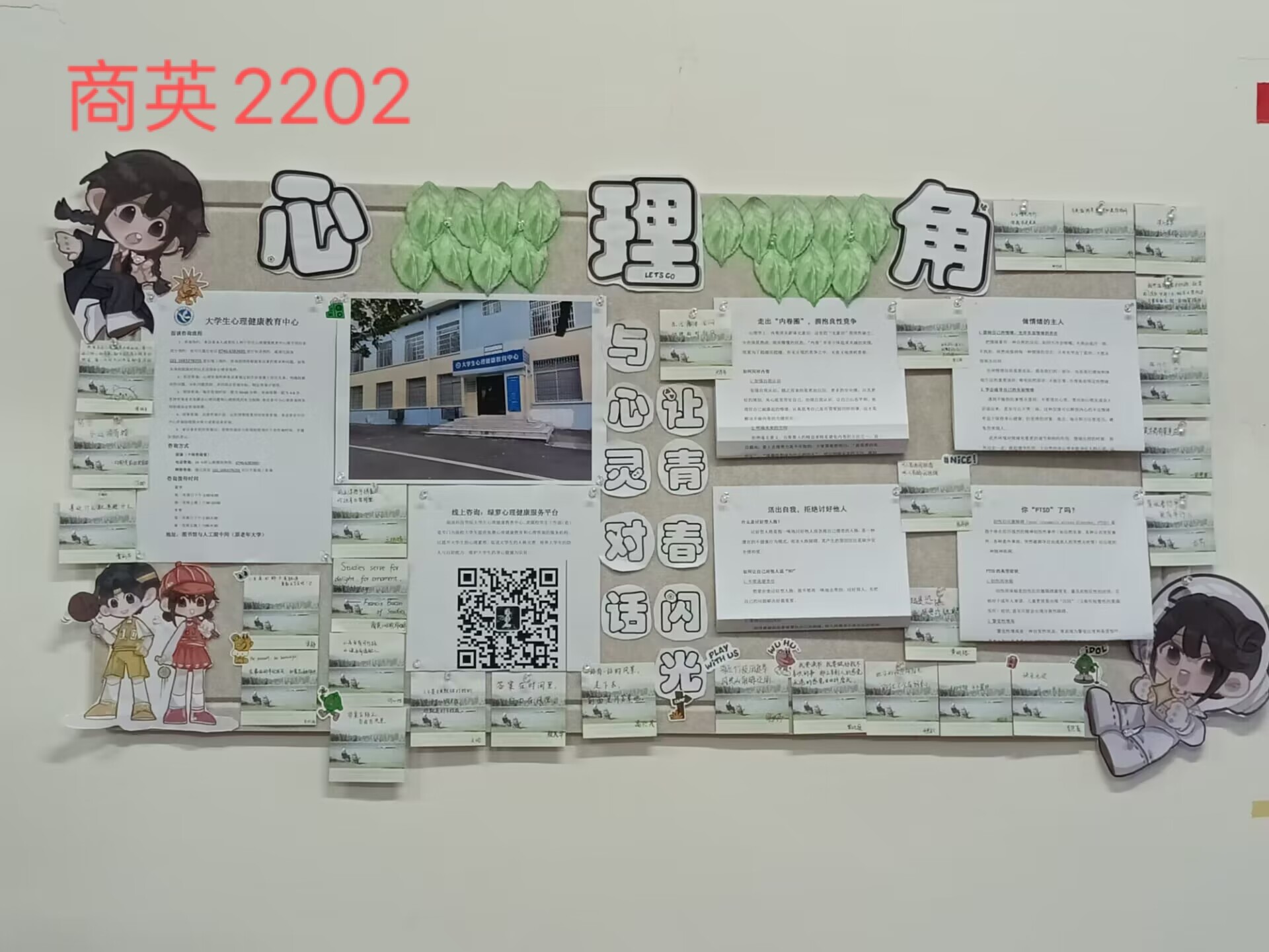 本网讯 为促进大学生心理健康和全面素质发展,帮助学生掌握心理健康相关知识,5月14日,外国语学院组织开展了以“与心灵对话,让青春闪光”为主题的心理角设计活动。
