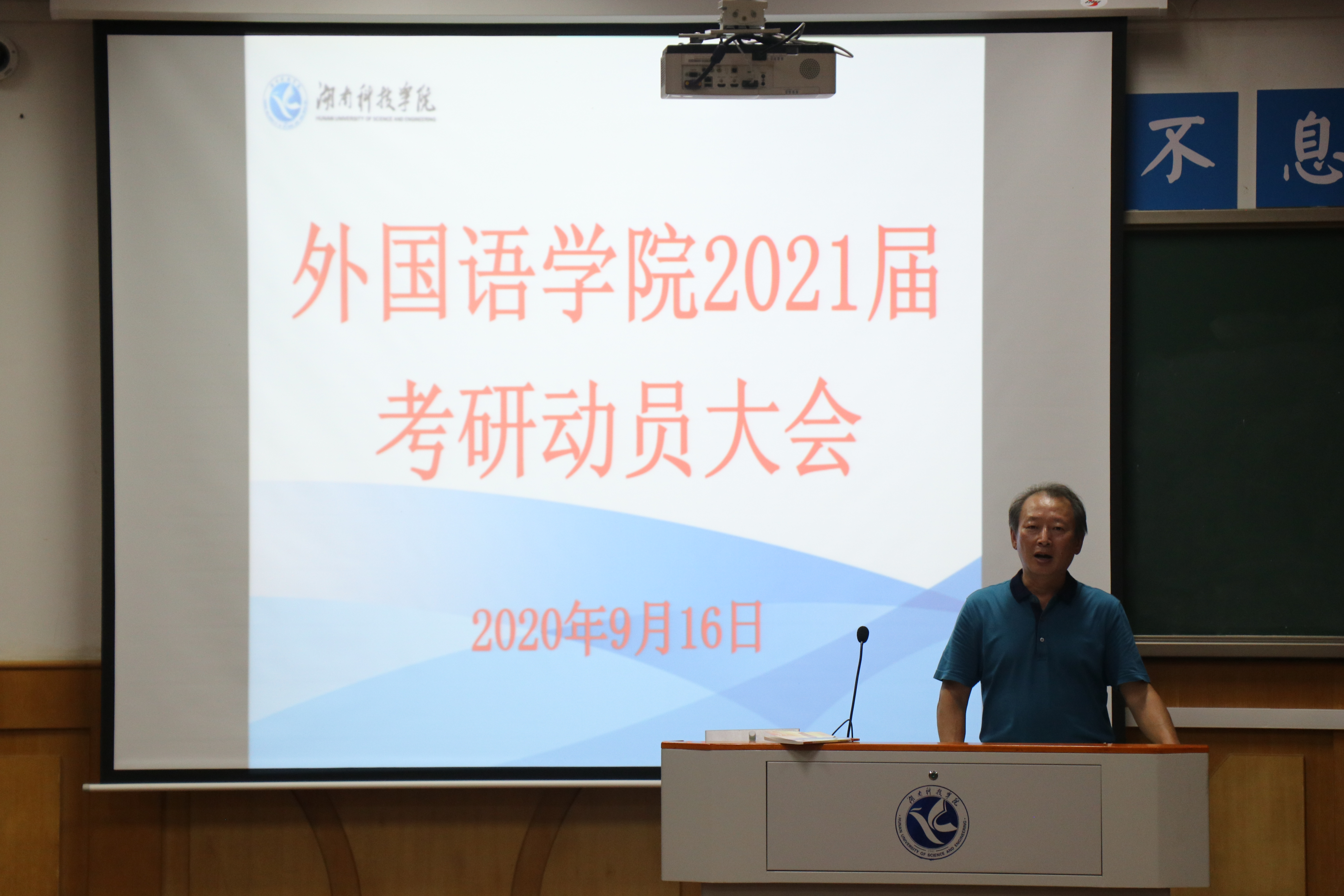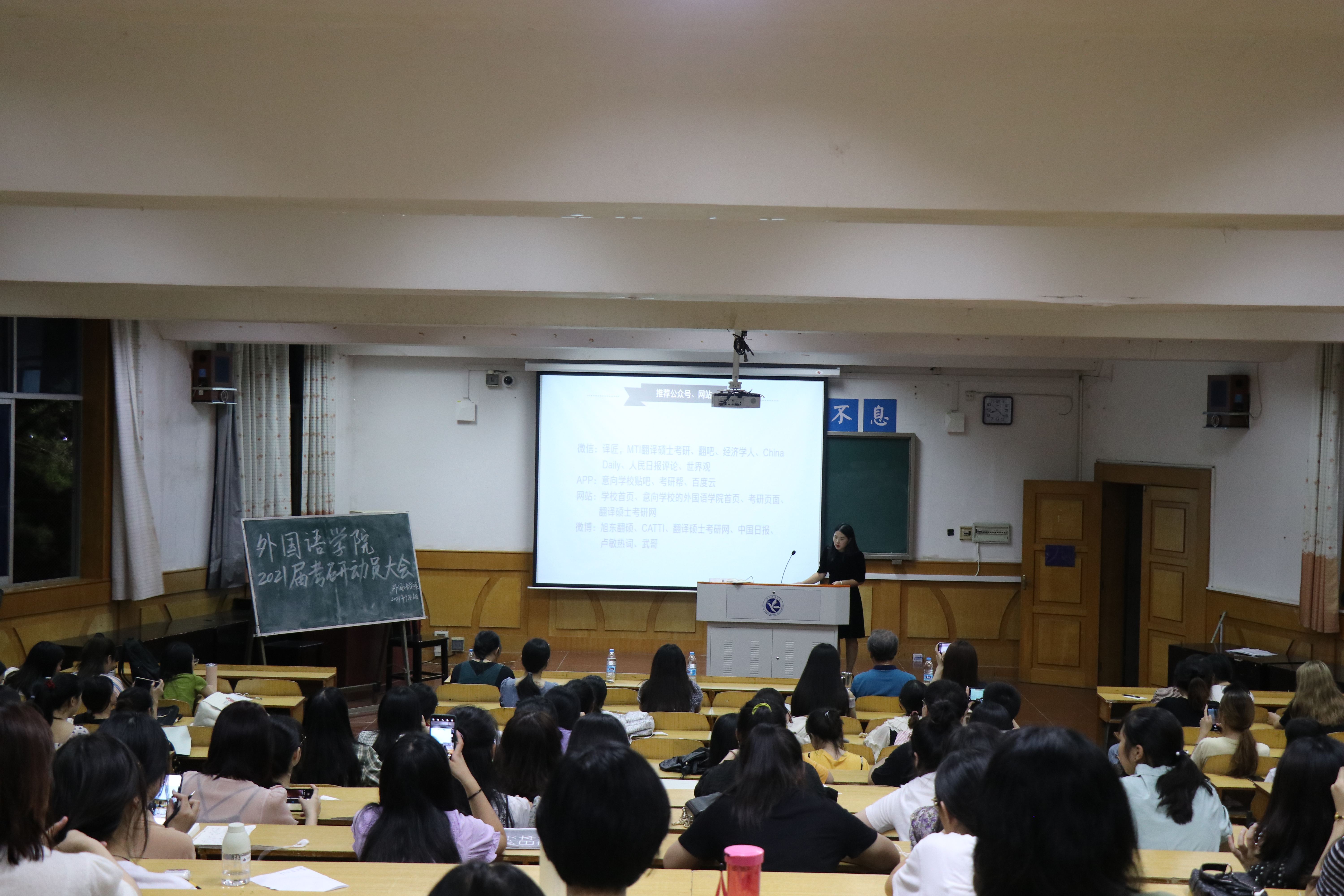 (本网讯 通讯员 刘罗 田金凤 摄影 陈丽菲)9月16日晚,外国语学院在博雅楼西二举行了2021届考研动员大会,外国语学院院长欧华恩、商英1701班班主任郭旭明、青年骨干教师黄警慧、潘缌缌,以及近120多名考研学子共同参会,大会由学工办副主任、17级辅导员刘罗主持。