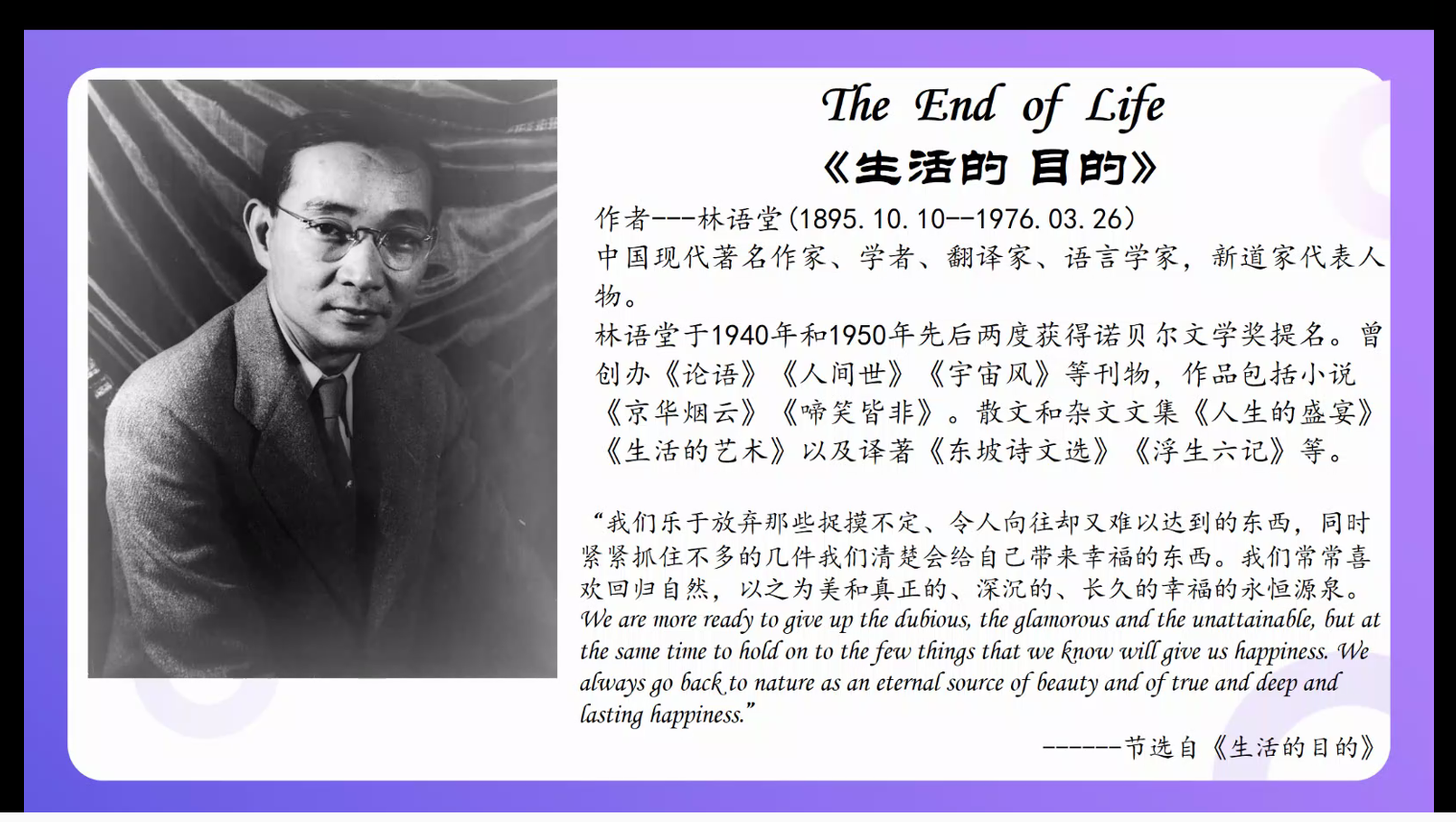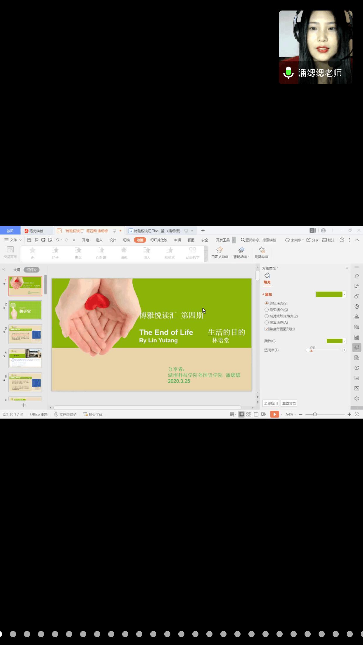 本次悦读汇邀请到的分享嘉宾是外国语学院专任教师潘缌缌,她曾荣获beat365中文官方网站实验实训教学比赛一等奖、beat365中文官方网站研讨式课堂比赛一等奖,她所分享的文章是林语堂的《The End of Love 生活的目的》。活动伊始,同学们以连麦的方式朗读了文章中自己喜欢的文段,并在评论区分享了自己在阅读过程中的所感所想。接着,潘缌缌老师为同学们介绍了文章写作的历史背景以及具体内容,以评论区互动的方式与同学们谈论了“生活的目的是什么”等系列话题。在倾听了同学们的朗读和感悟后,潘缌缌老师分享到:“从今天起,努力去做一个可爱的人,不羡慕谁,也不放弃目标,保持一颗萌萌哒的心,努力坚持进步。成长路上只有自己责无旁贷,所以你除了努力别无选择。真正重要的不是生命里的岁月,而是岁月里的生活。愿你们都能成为一个可爱的人”。
