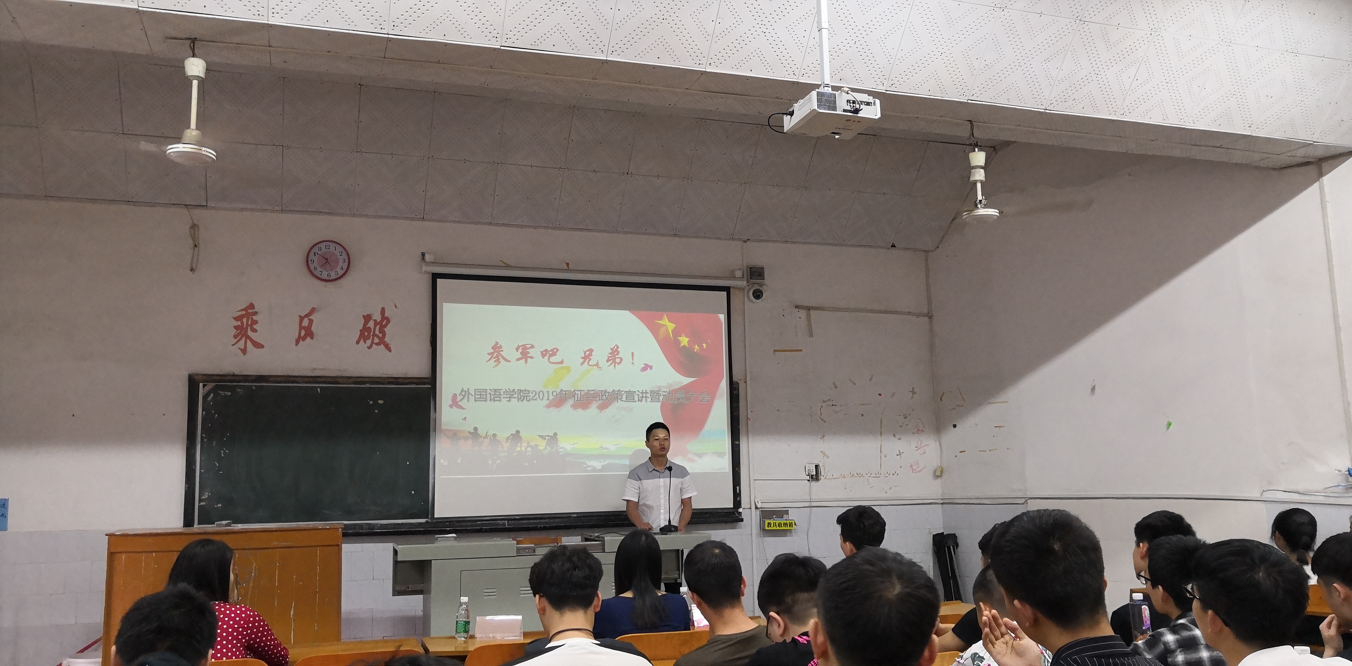 本网讯(通讯员 郑云华)建功新时代,青春献国防。4月26日下午,外国语学院2019年征兵政策宣讲暨动员大会在博雅楼东1-1召开。外国语学院党总支副书记、副院长罗晶;18级辅导员王素芳老师;17级辅导员杨佳;beat365官网退役复学的经济与管理学院统计学1601班谌明江同学和电子与信息技术学院通信工程1601班许收同学以及我院各年级有参军意向的同学出席本次会议。大会由王素芳老师主持。