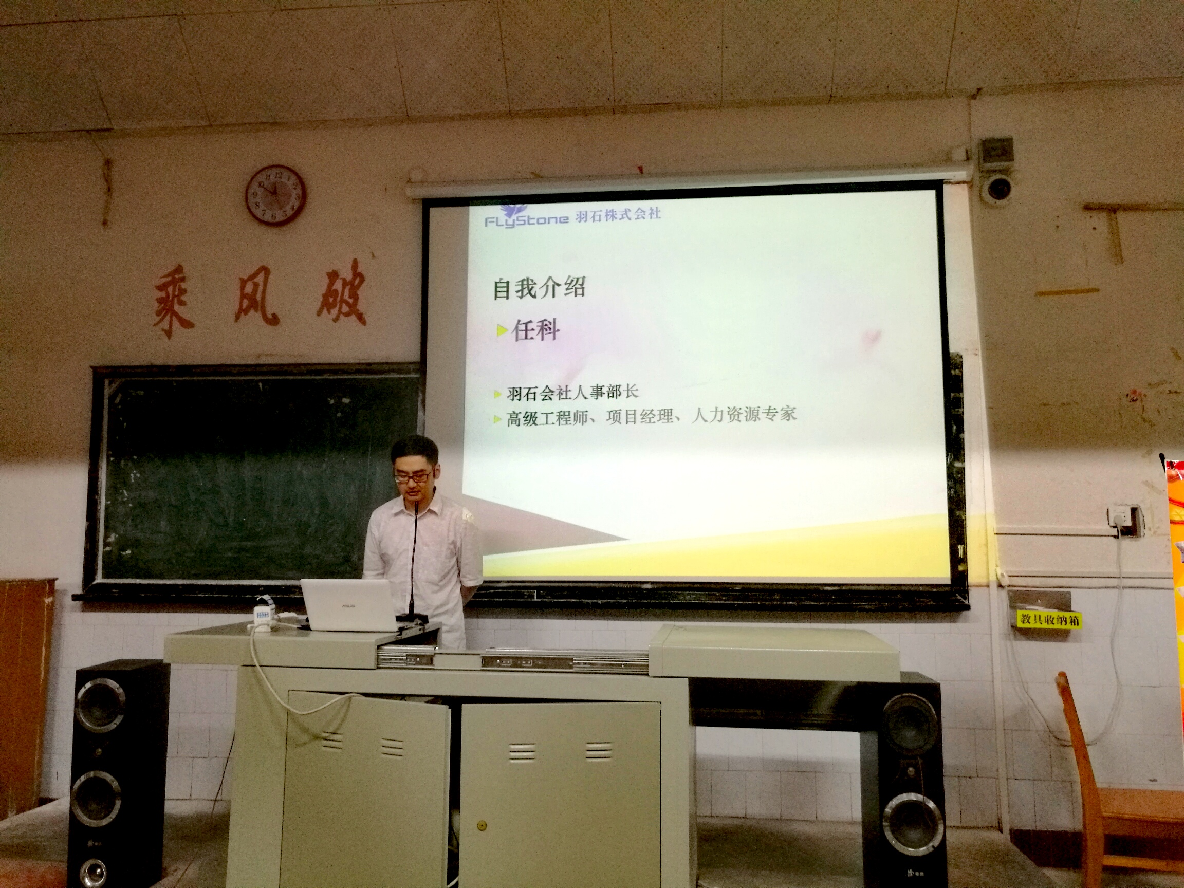 本网讯(通讯员 孙浩翔)6月8日,外国语学院于博雅楼东1-1教室,举办“赴日对日”beat365中文官方网站外国语学院招聘宣讲会。出席本次宣讲会的嘉宾有羽石株式会社人事部长代理任科先生、羽石株式会社中国区负责人舒适先生。宣讲会由外国语学院团委书记陈小峰老师主持,14级全体日语专业学生参加了宣讲会。