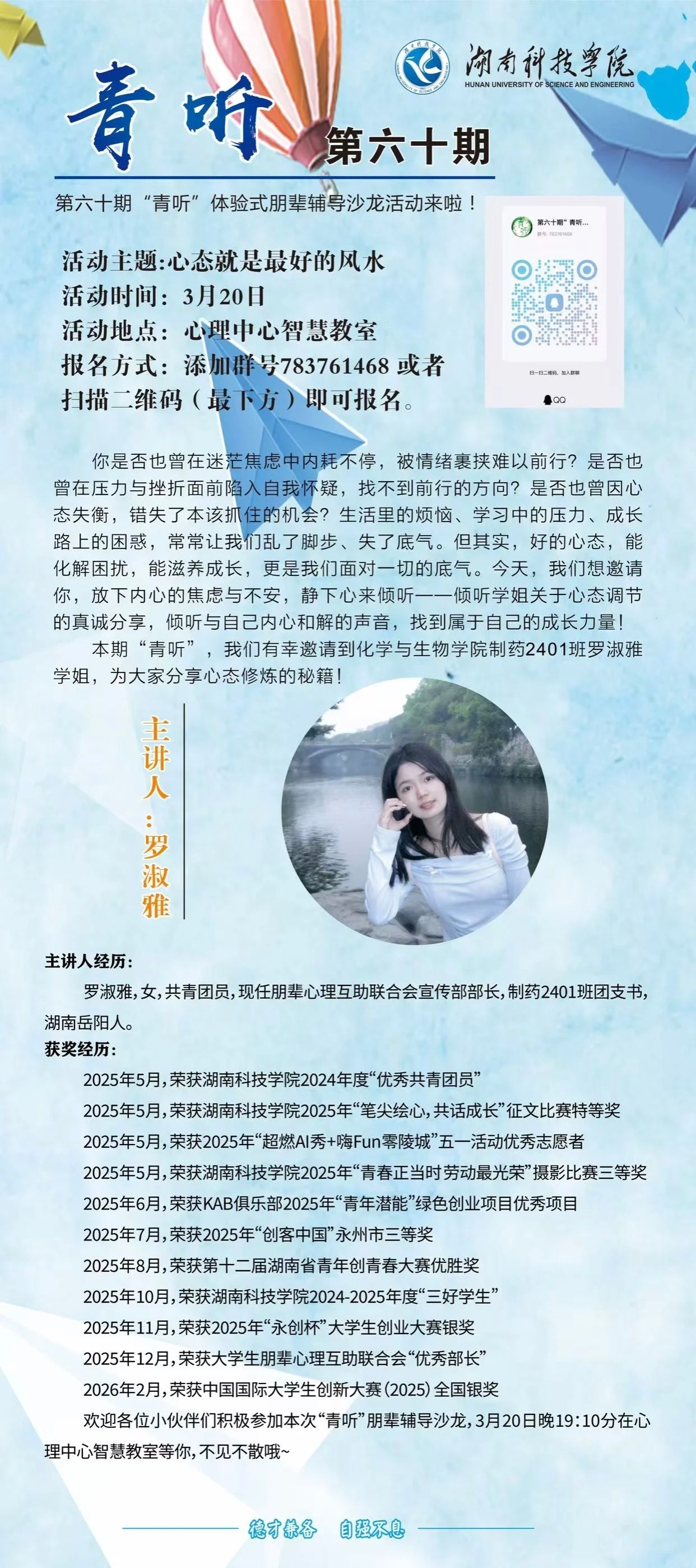 欢迎各位小伙伴们积极参加本次“青听”朋辈辅导沙龙3月20日晚19:10分在心理中心智慧教室等你,不见不散哦~