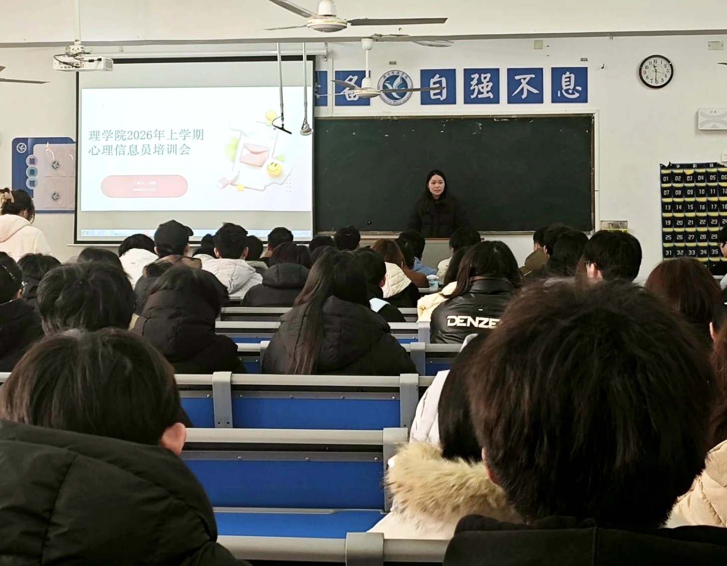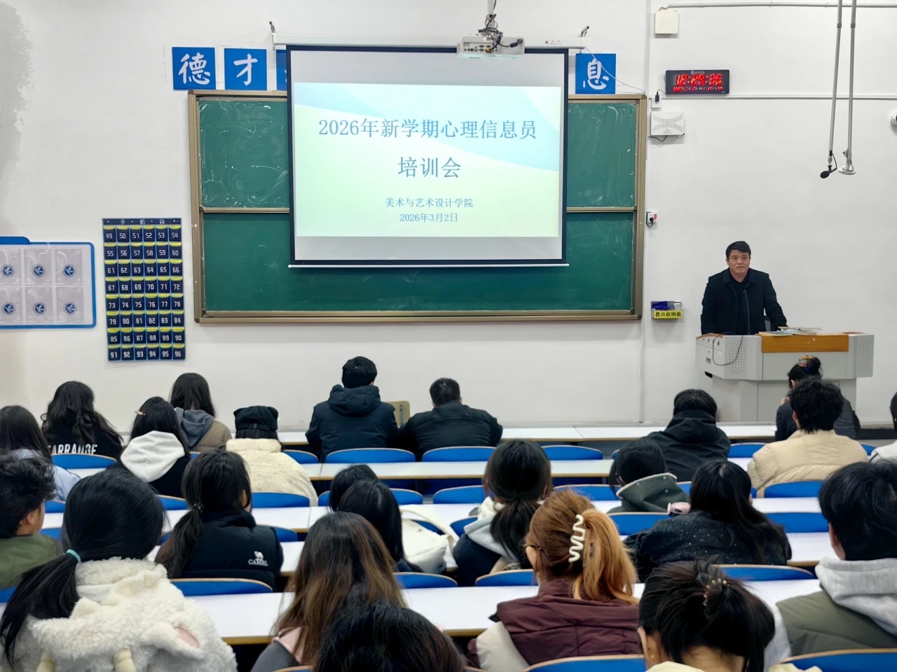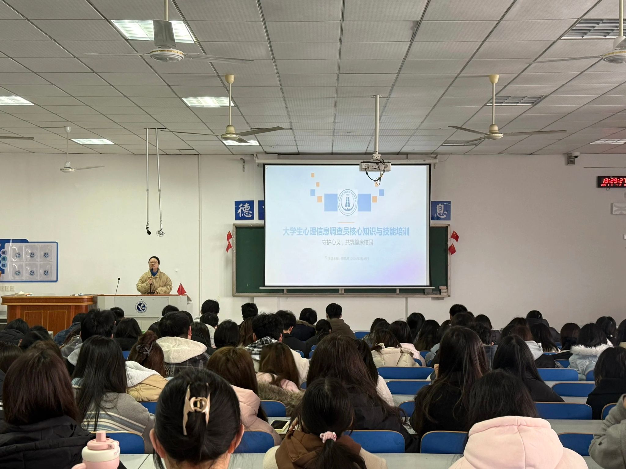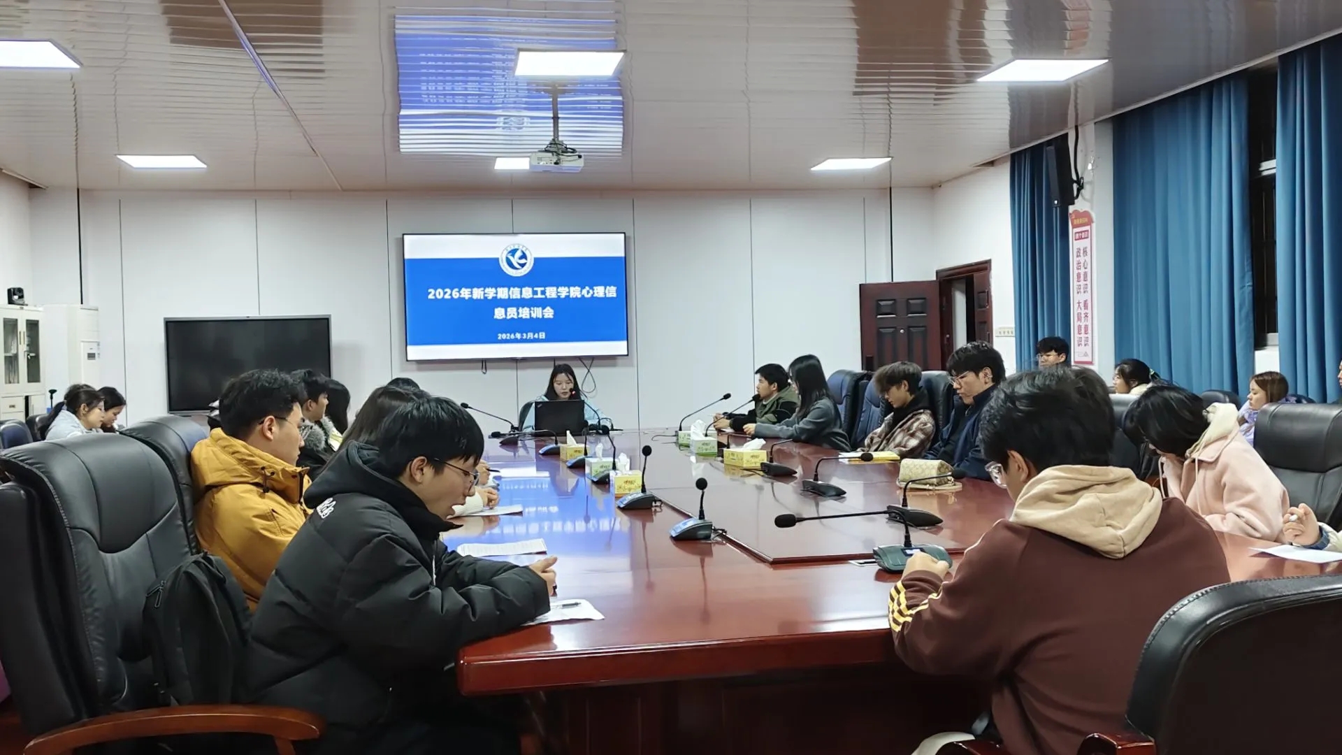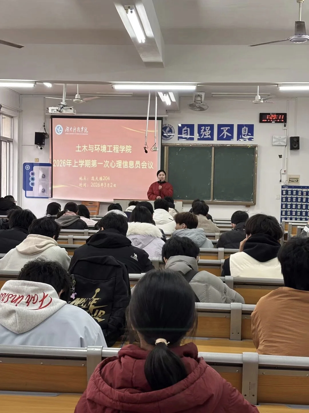 信息工程学院于3月4日晚上6:50-7:30在知行楼106教室开展会议,由向慧蓉老师主讲,全体心理信息员参训。