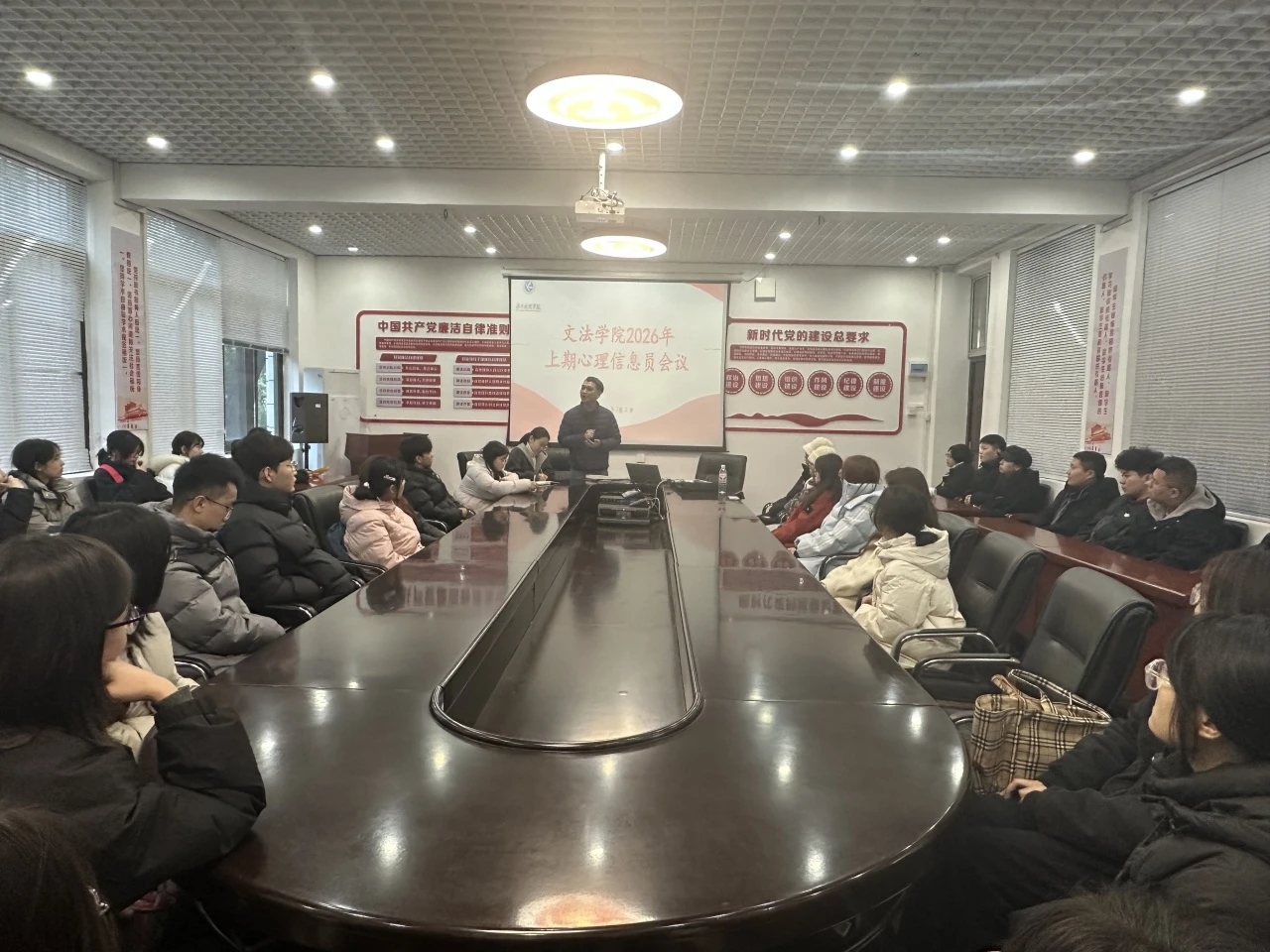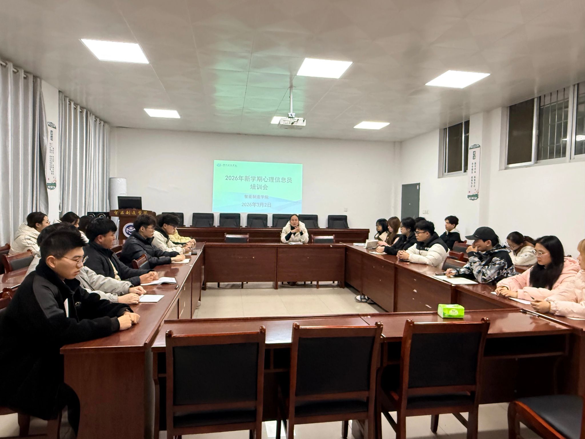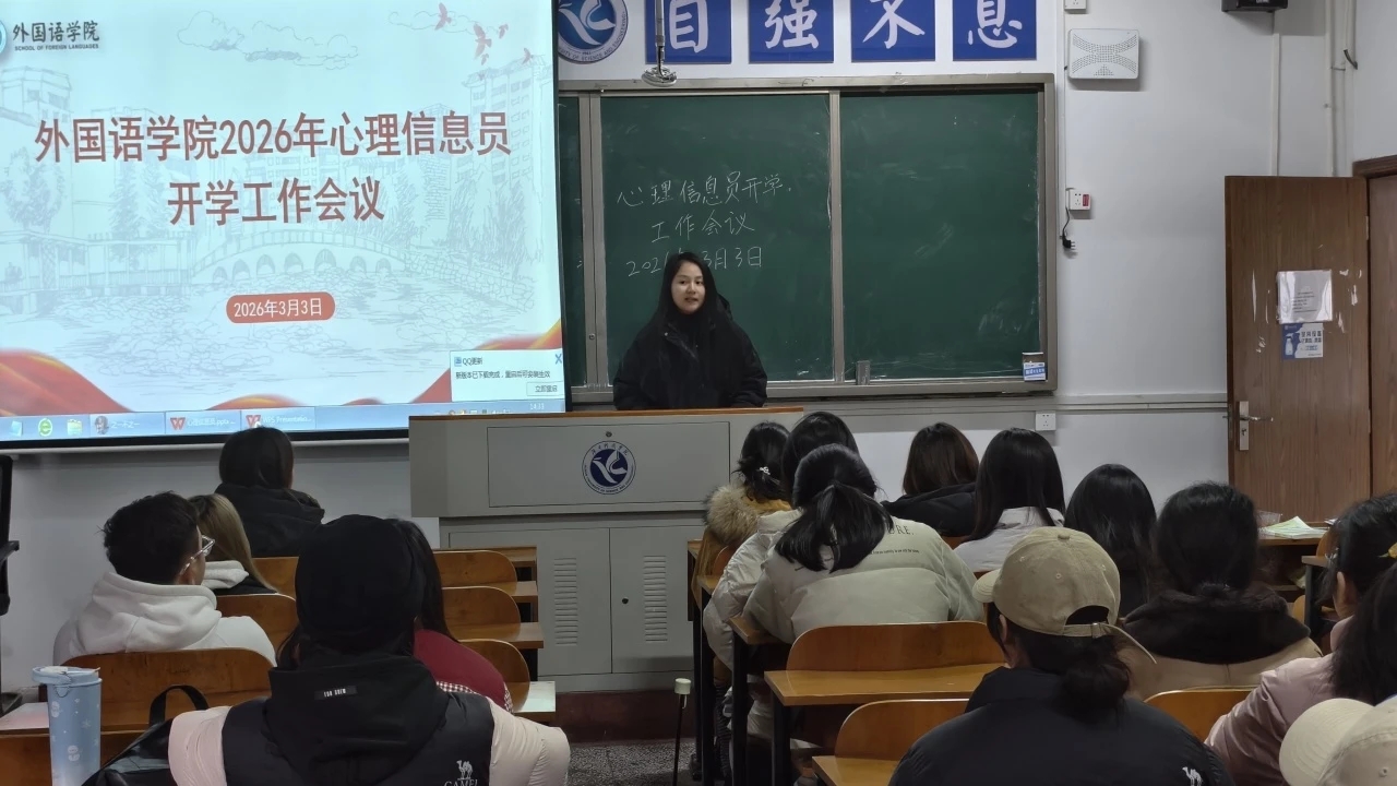 外国语学院于3月3日下午在校内教室开展会议,由黄雅丽老师主讲,全体心理信息员参训。