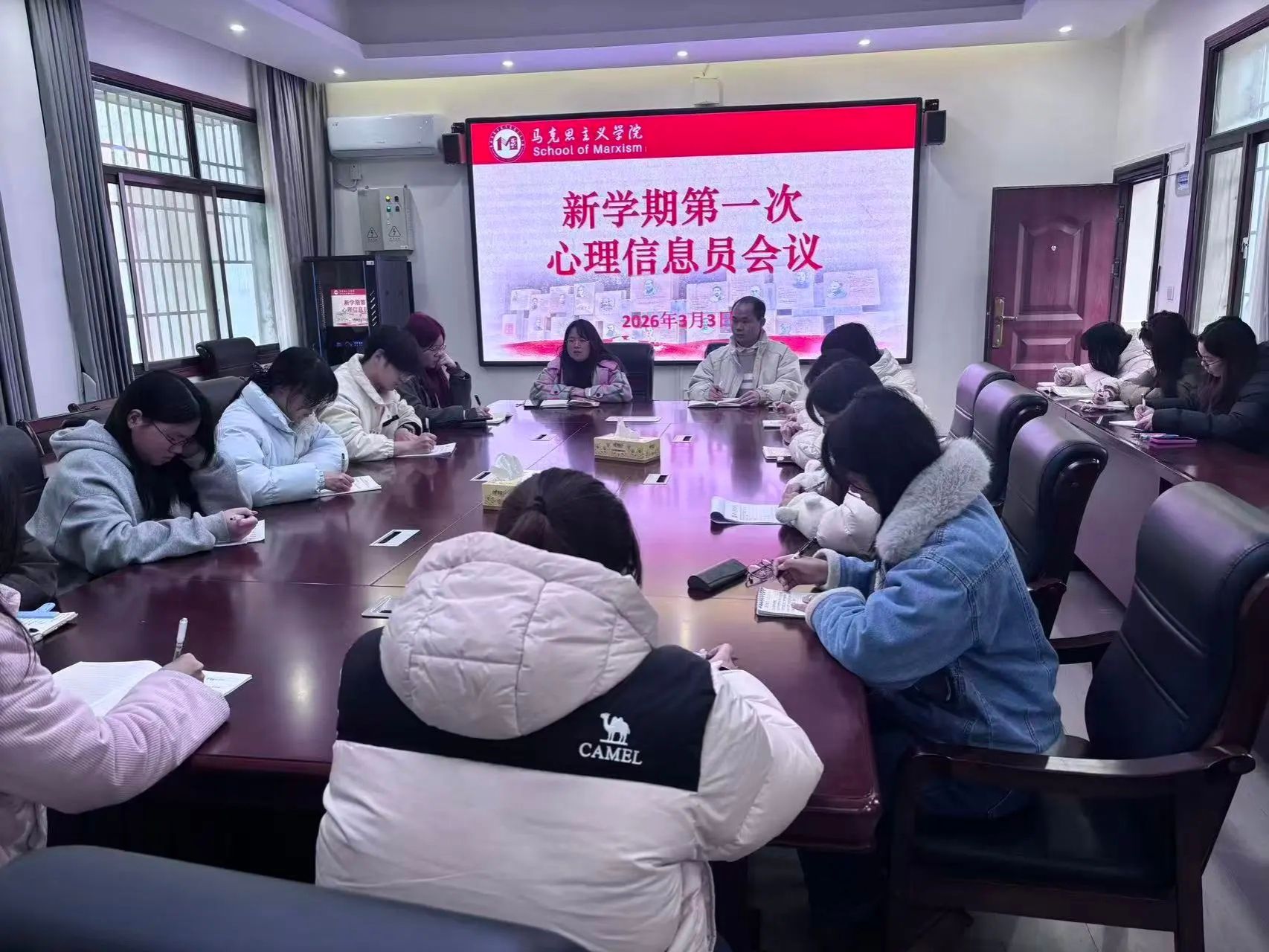 马克思主义学院于3月3日下午4:20-5:30在鹤鸣楼405室开展会议,由曹惠如老师主讲,全体心理信息员参训。