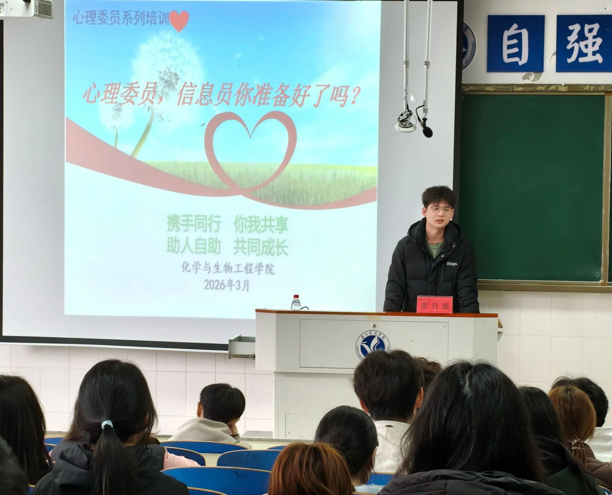 化学与生物工程学院于3月9日中午在逸夫楼424教室开展会议,由张自强老师主讲,全体心理信息员参训。