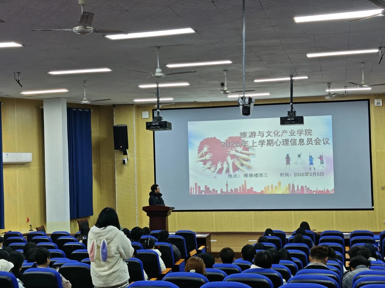 旅游与文化产业学院于3月5日晚上在博雅楼西三教室开展会议,由李满老师主讲,全体心理信息员参训。