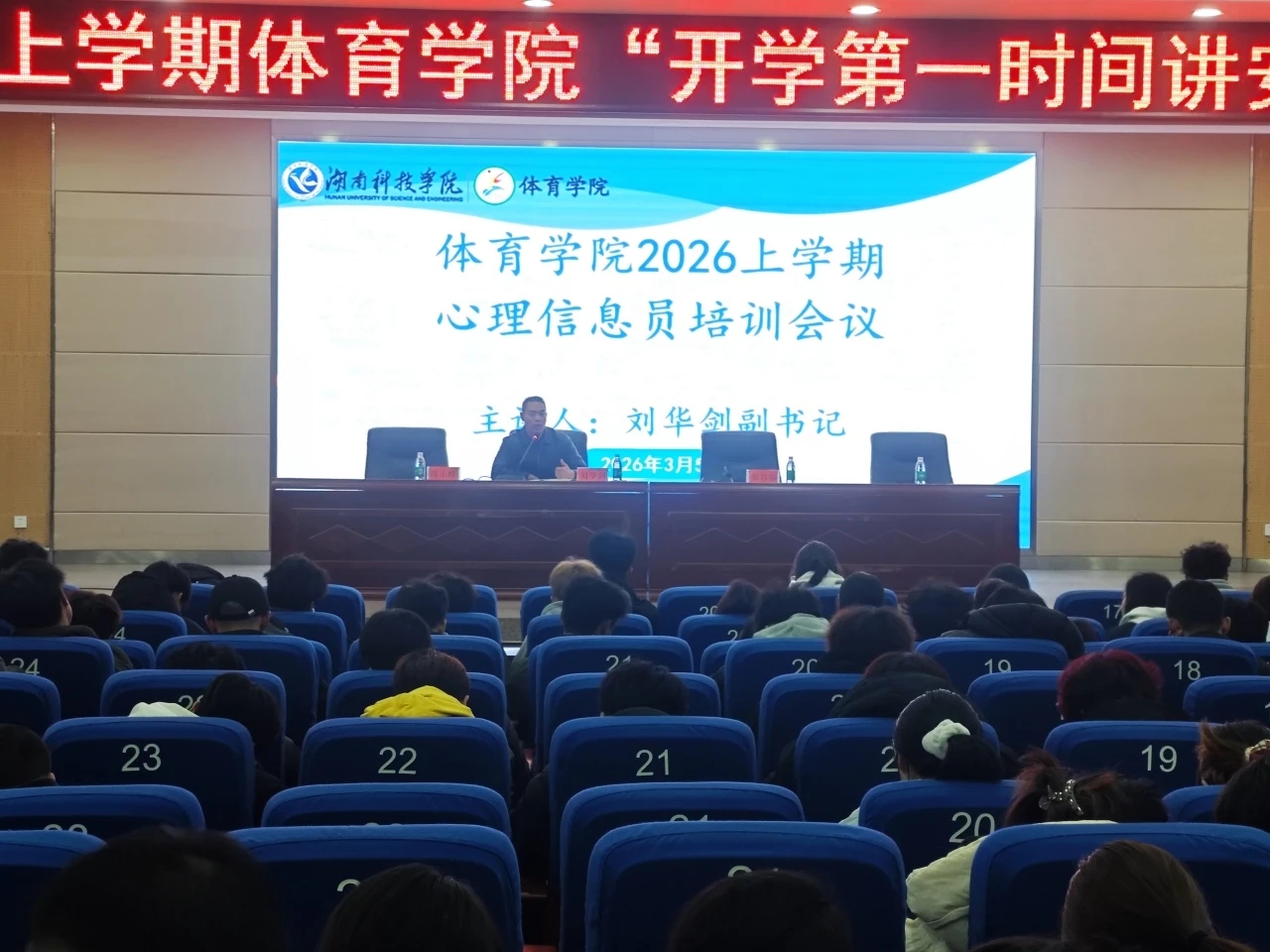 体育学院于3月5日晚上在潇湘大讲堂开展会议,由刘华剑副书记主讲,全体心理信息员参训。