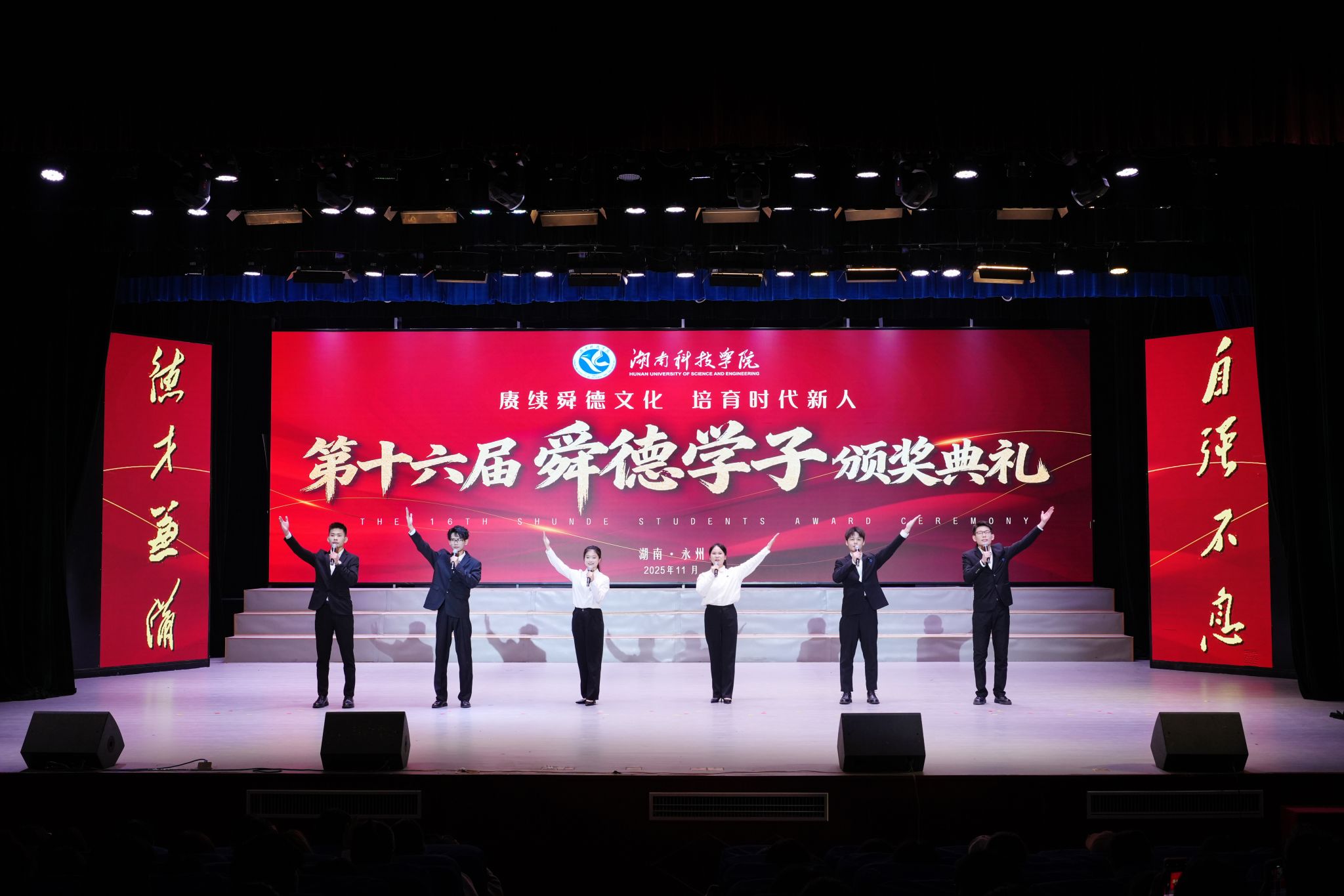 典礼上,气势恢宏的古筝合奏《盛世国乐》、温情脉脉的歌舞《在你身边》、刚柔并济的武术《演武》、典雅庄重的歌舞《中国礼》、厚重恢弘的舞蹈《铅华·满壁》等节目接连上演,共同呈现了一场震撼人心的视听盛宴,最后还由本届舜德学子六名代表带来原创朗诵节目《德泽流芳,舜德新风》,讲述各自用青春书写的现代版“舜德故事”。
