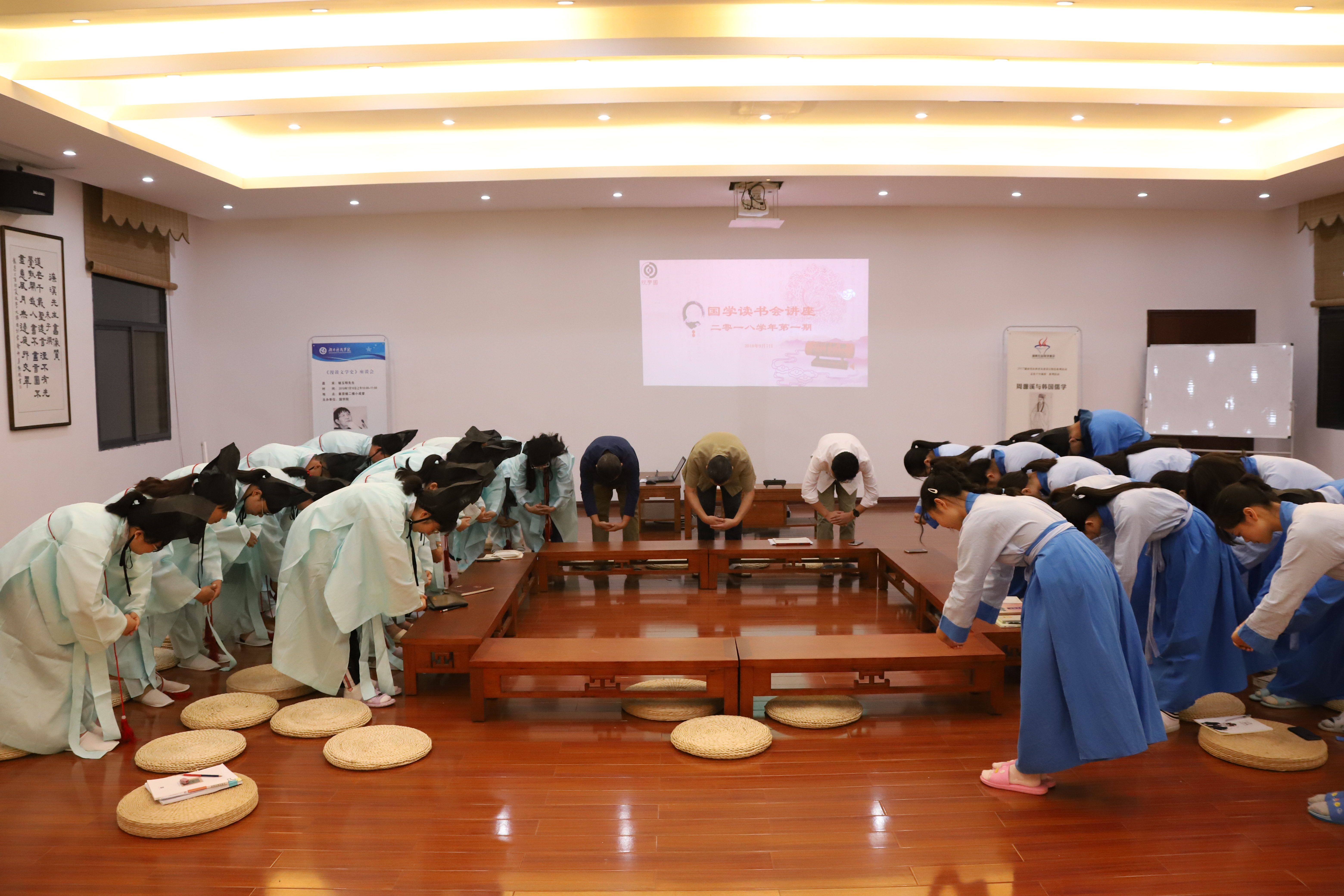 讲座在美轮美奂的集贤楼小成堂举行,男老师们穿着唐装,国学院17级学生穿着自己缝制的淡蓝色汉服,18级新生和其他成员统一穿着青绿色的汉式传统礼服。活动开始前,我们看到17级学生在帮助其他同学系衣带、腰带和缁布冠。讲座伊始,大家分坐在两边,举行了传统的“相见礼”,双手端拱在胸前,相互揖拜,起身,以手加额。礼毕,师生一一席地而坐在蒲团上,统一的素色汉服,统一的青衣黑帽,此时的小成堂仿佛就是古代的书院,开始了最朴素又最具韵味的学术讲座。