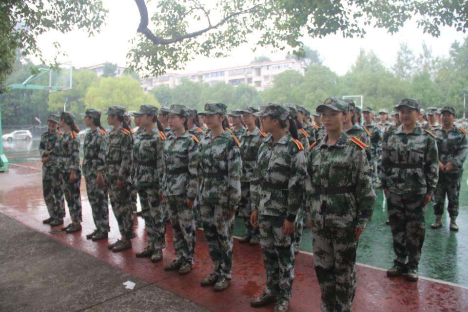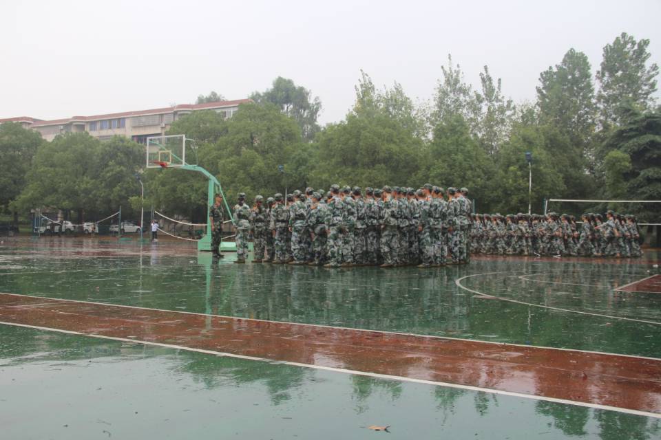 九月,激情飞扬,是充满热血的,是朝气蓬勃的。转眼为期十多天的军训时间已经过半。18级全部新生已完全习惯艰辛的军训生活,近乎整齐的步伐走得铿锵有力,嘹亮的口号声响彻操场。正值此时,天公不作美下起了雨,但同学们也毫无抱怨,绷直的双腿,挺直的后背,昂首挺拔地站着军姿。立正、稍息、齐步走,在教官们严格要求下,同学们依旧认真训练,一次一次重复着动作,用行动证明自己钢铁般的意志。雨水混着汗水留下帽檐,湿透的绿装,显得格外炫彩。在场的老师与同学也纷纷收起雨伞,与同学们共同享受这燥热后的一丝甘甜。