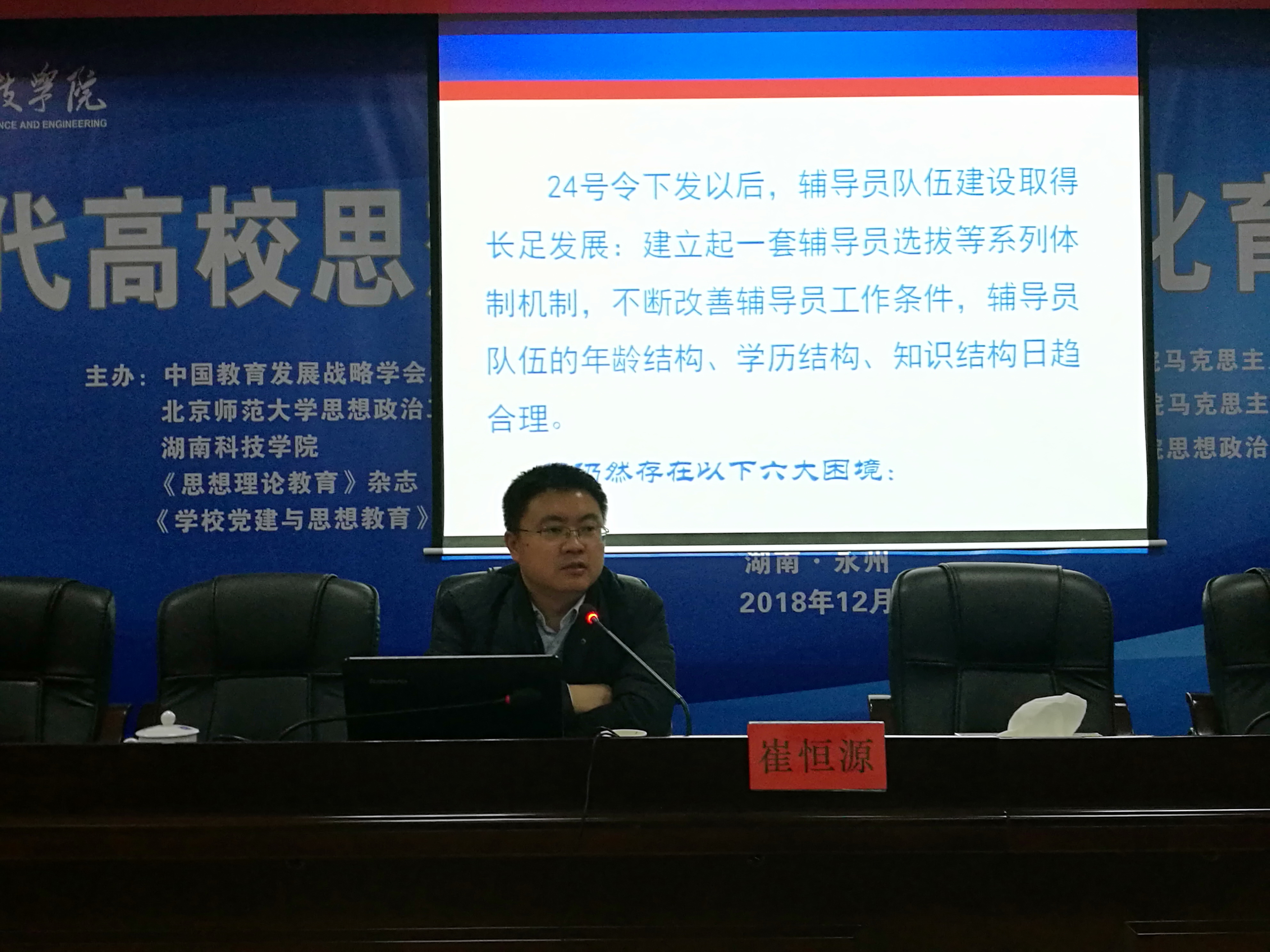 本网讯(通讯员罗晶奉苏妹)12月10日上午,学工部邀请到湖南省教育工委宣传部副调研员崔恒源来校作专题讲座。讲座由学工部副部长胡敏辉主持,各教学学院党总支副书记、全体辅导员以及班主任代表参加。