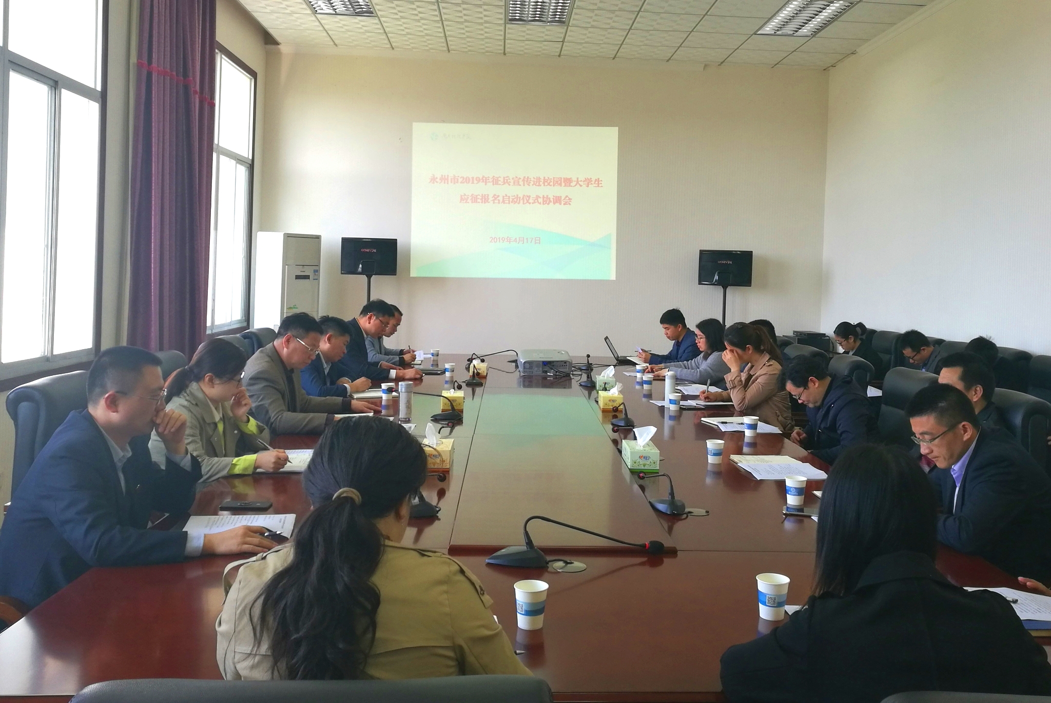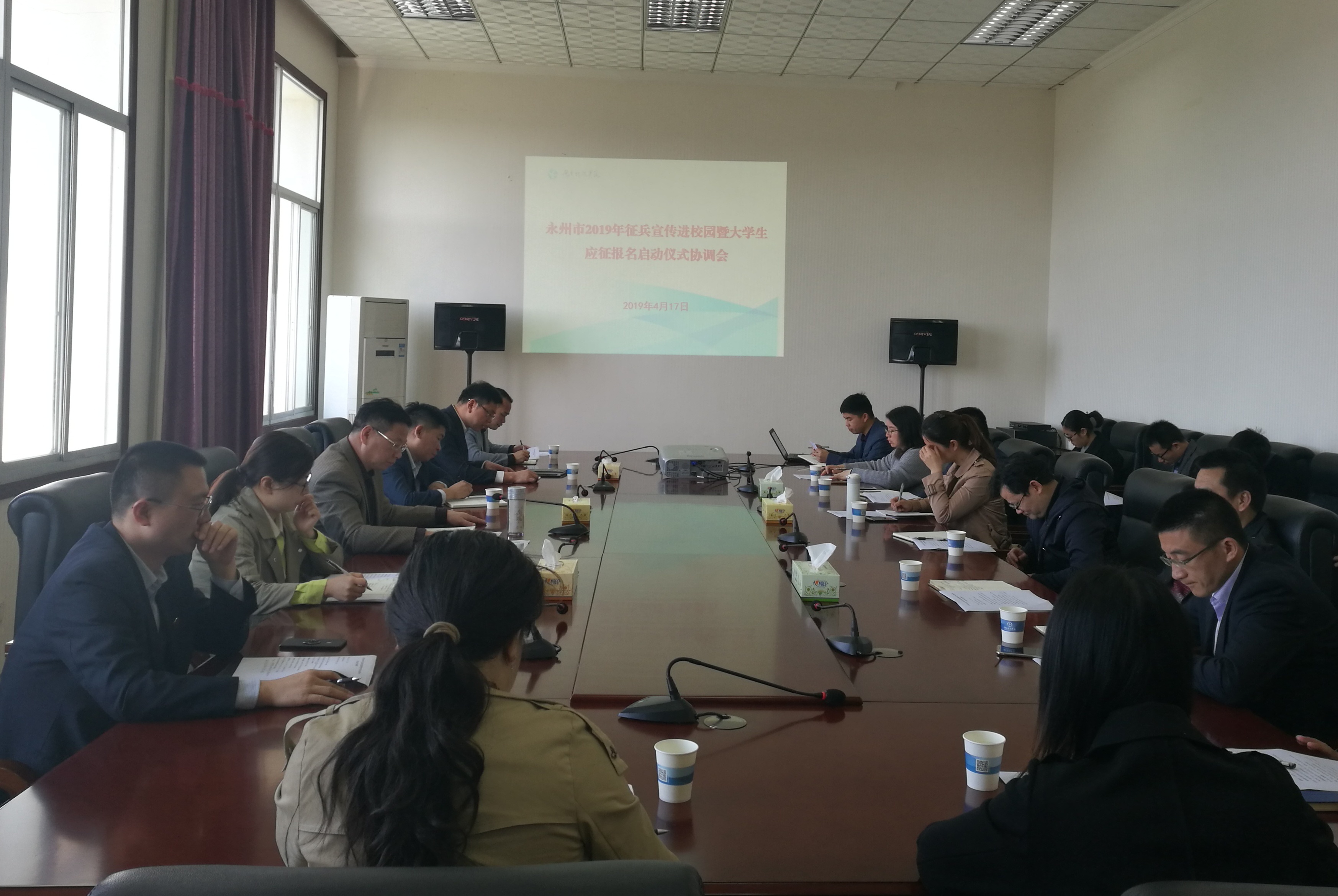为响应上级要求,顺利开展征兵工作,4月17日,beat365官网召开永州市2019年征兵宣传进校园暨大学生应征报名启动仪式协调会。会议由学工部、武装部部长唐华山主持,党政办公室、宣传部、保卫处、后勤服务总公司等部门主要负责人、各教学学院党总支副书记及学工部相关人员参加会议。