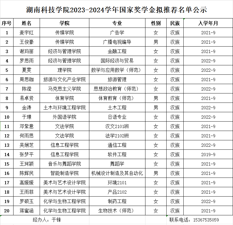 根据湖南省教育厅等5部门关于印发《湖南省学生资助资金管理办法》的通知(湘财教〔2022〕13号)、湖南省学生资助管理中心《关于做好2024年普通高校国家奖助学金评审工作的通知》(湘学助〔2024〕30号)文件要求和《beat365中文官方网站学生奖励办法》、《beat365中文官方网站学生资助管理办法》、《beat365中文官方网站国家奖学金、国家励志奖学金、国家助学金管理办法》有关规定,学工部于2024年9月25日召开资助专干会议,安排部署评奖工作。经学生个人申请,各学院初审、公示,学工部审核。拟推荐化学与生物工程学院蒋蜜涵等20名同学参评2023-2024学年国家奖学金。